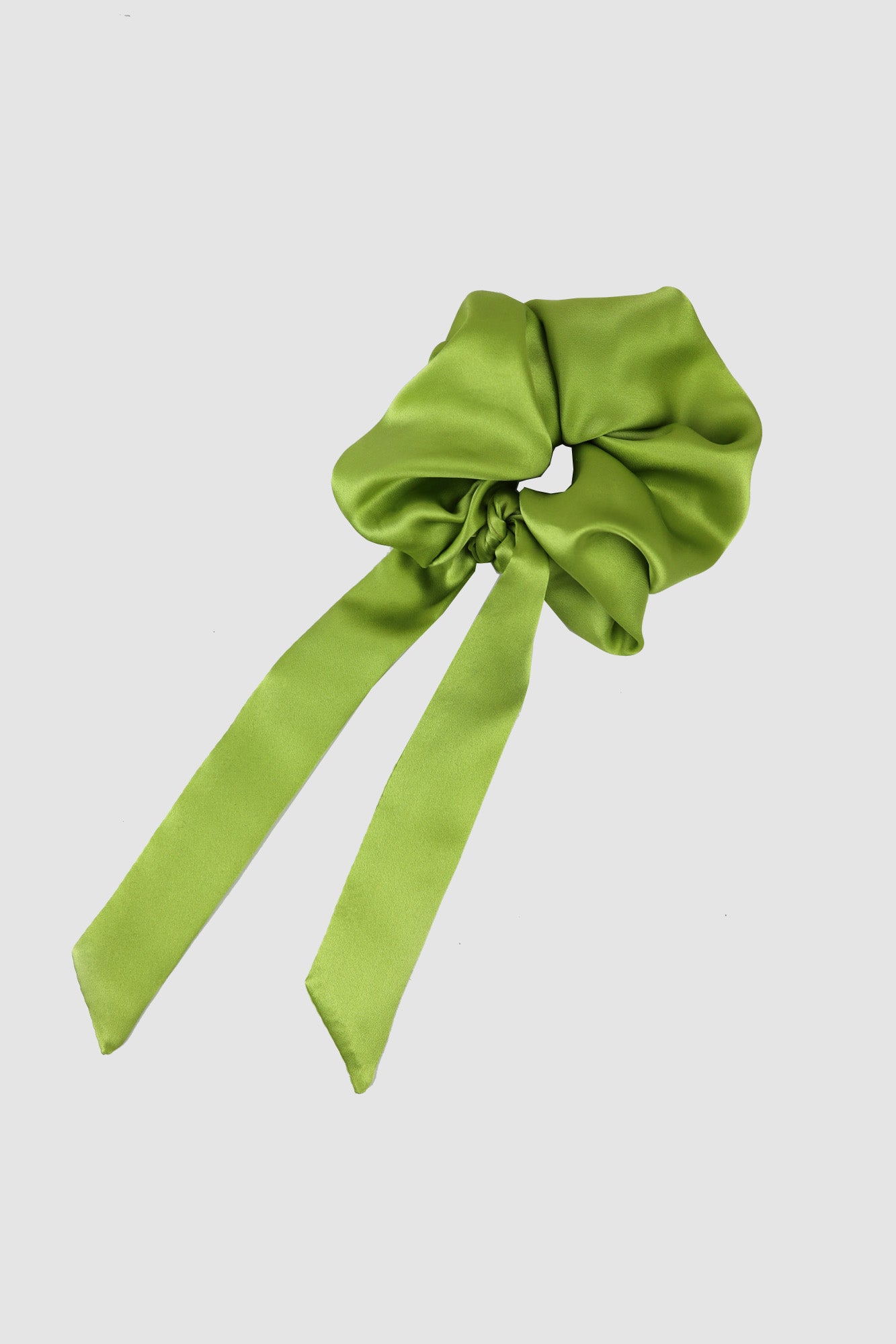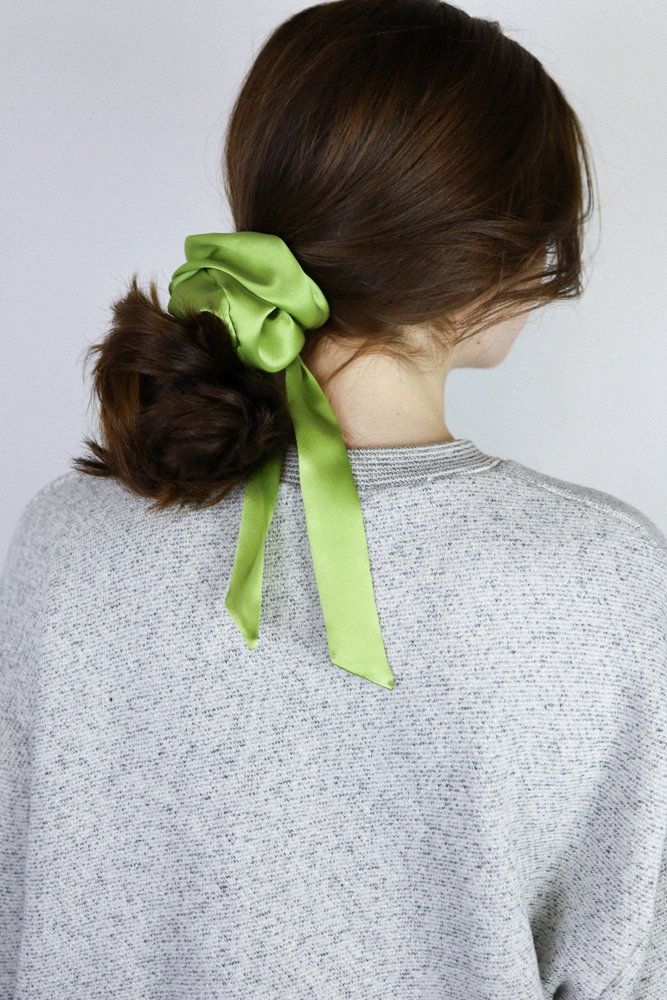Treat your hair to luxury with our 100% silk scrunchie, available in rose and chartreuse with a removable tie.