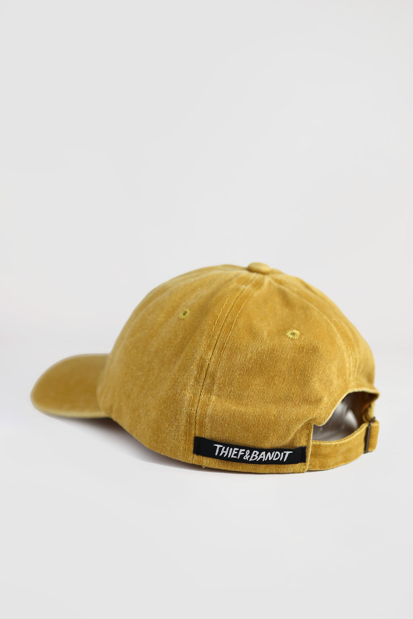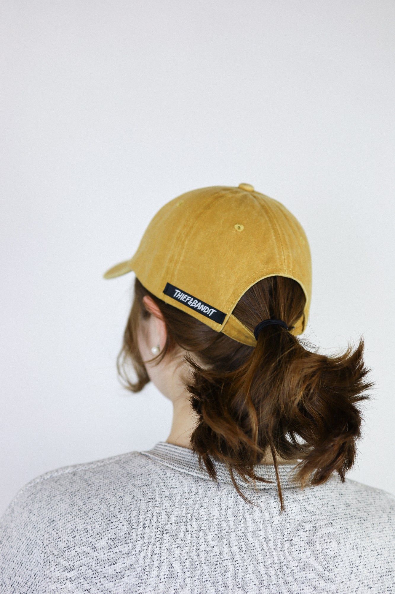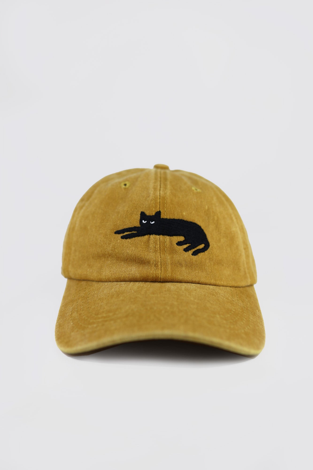Person wearing a mustard yellow cap with a black cat design against a white background