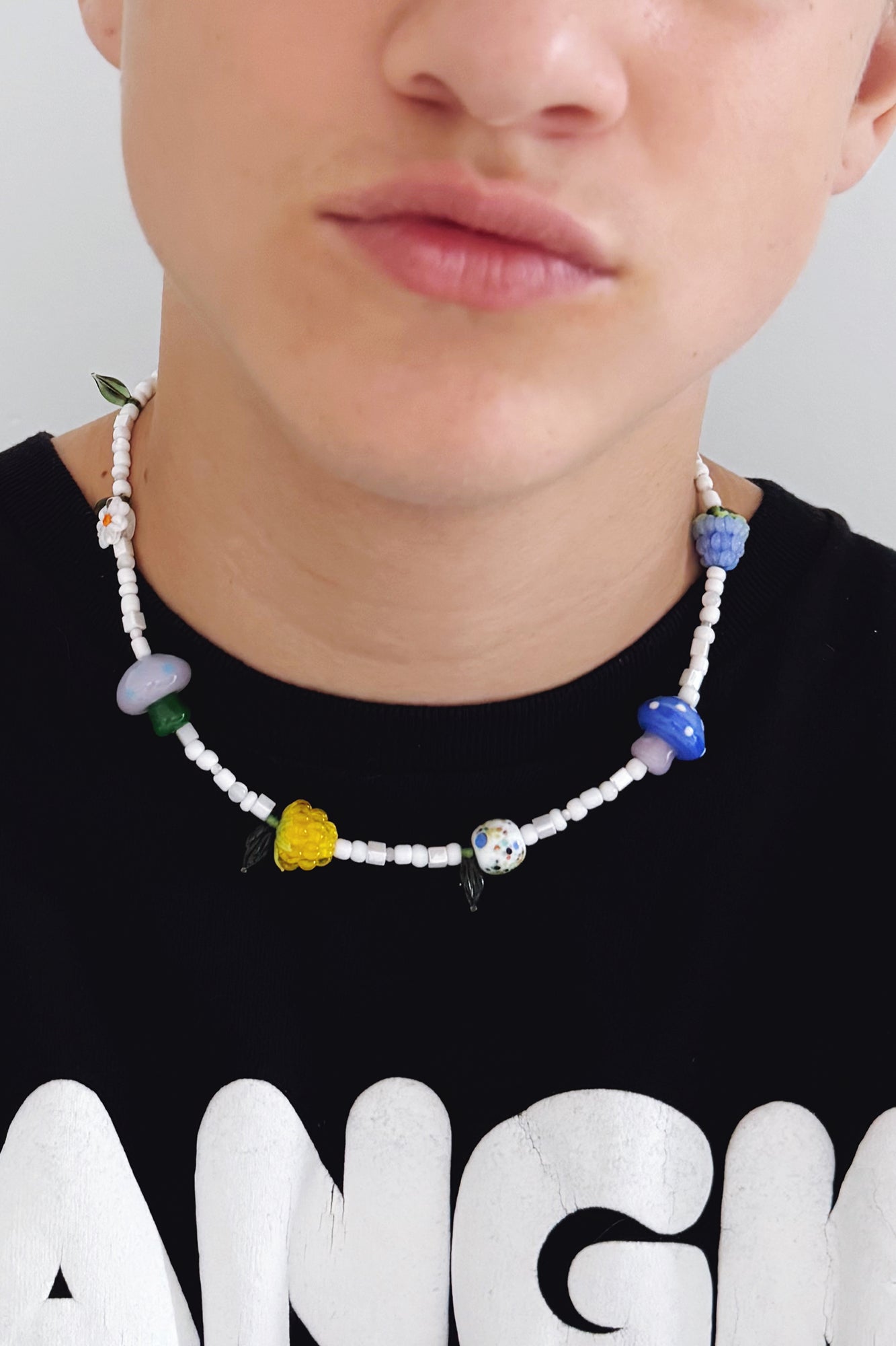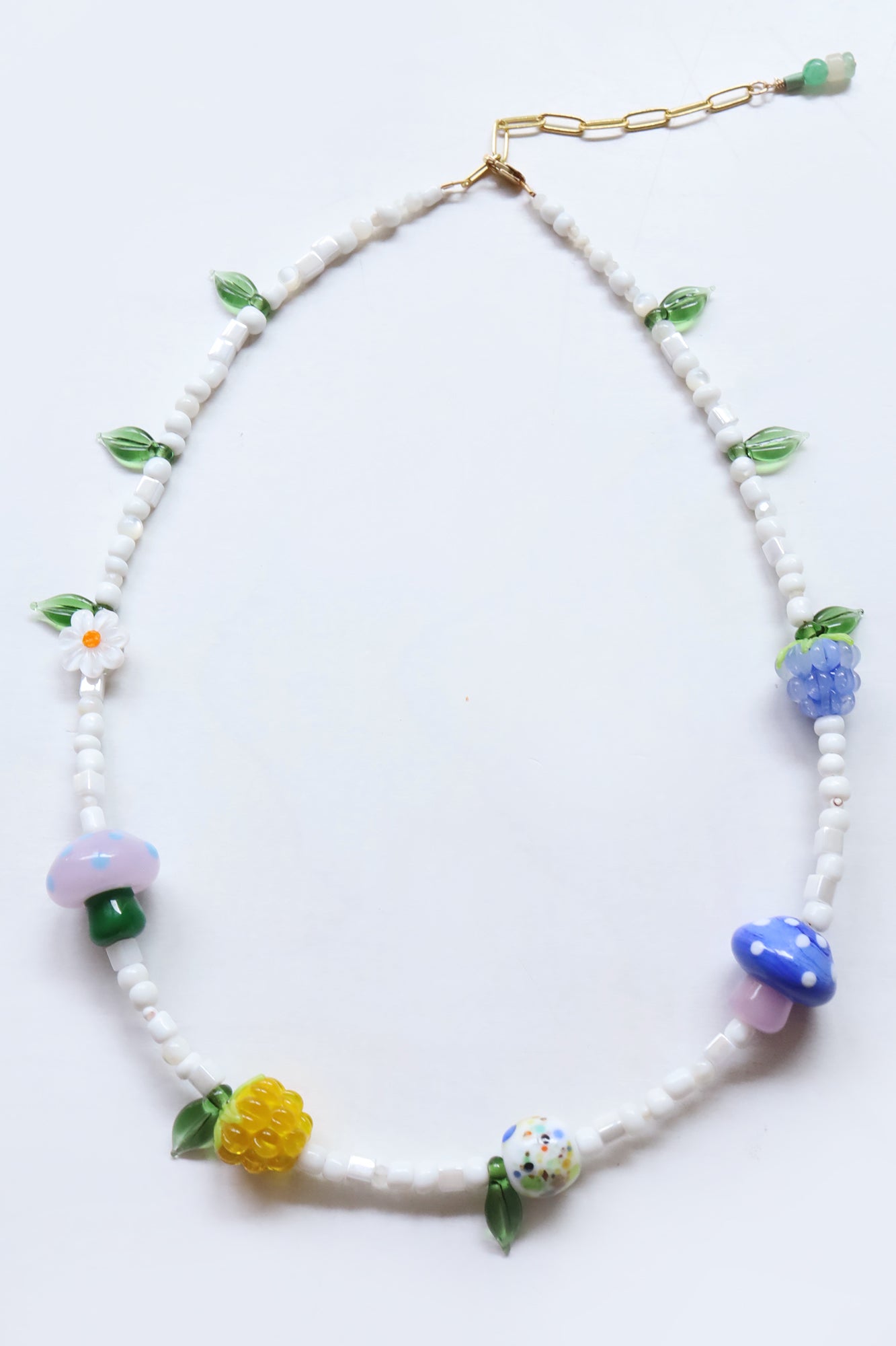 These one of a kind necklaces feature juicy hand blown glass beads made by artisans in the Ukraine. Hand assembled in house, each has a gold filled clasp and findings that will not tarnish. Golded 'paper clip' extension makes necklace adjustable.