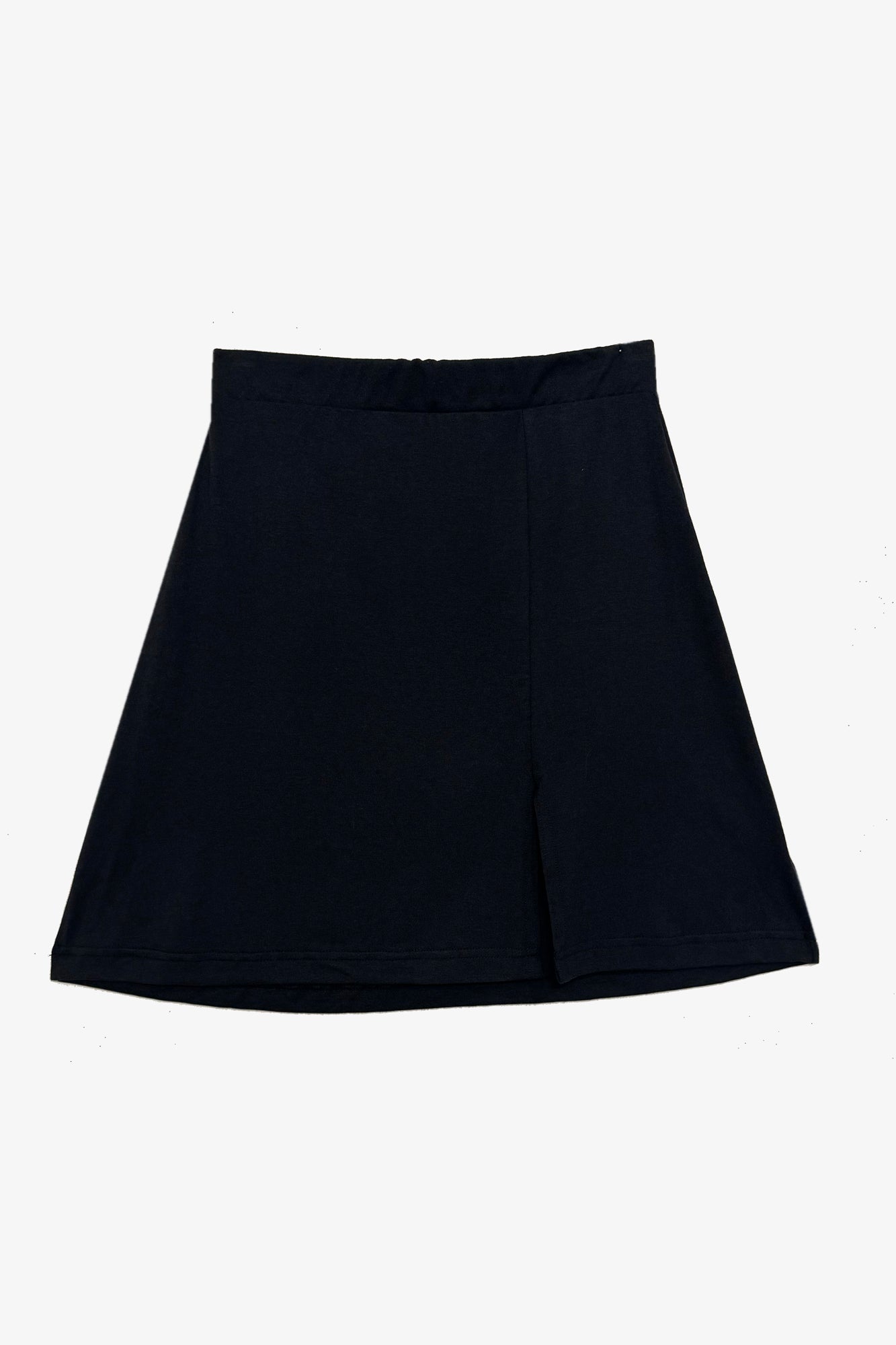 Printed on our signature organic cotton, bamboo blend jersey it features a soft elasticized waistband, a spicy, slight slit and a flattering a-line shape.