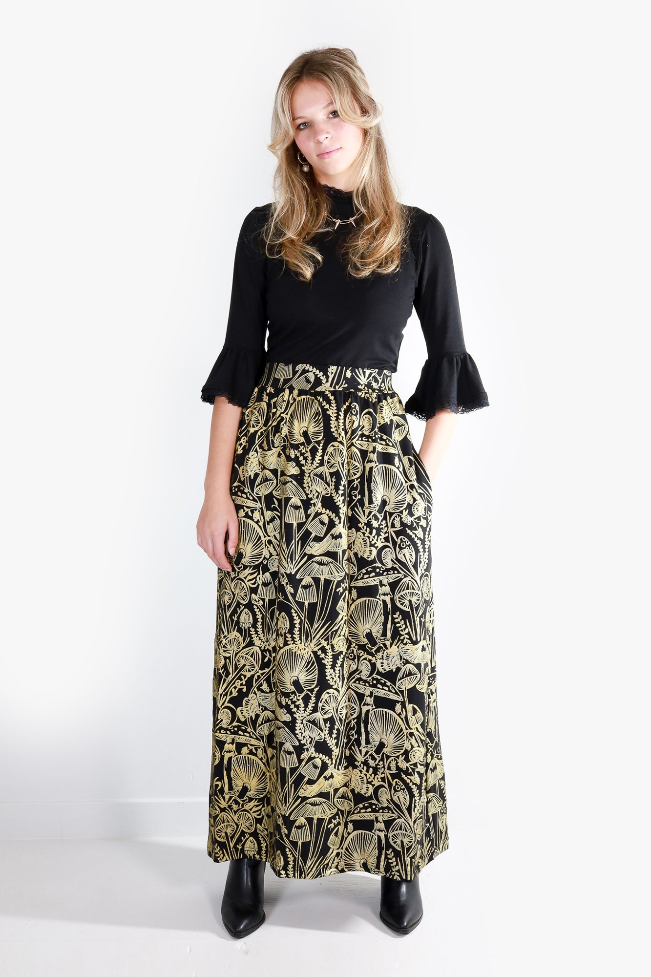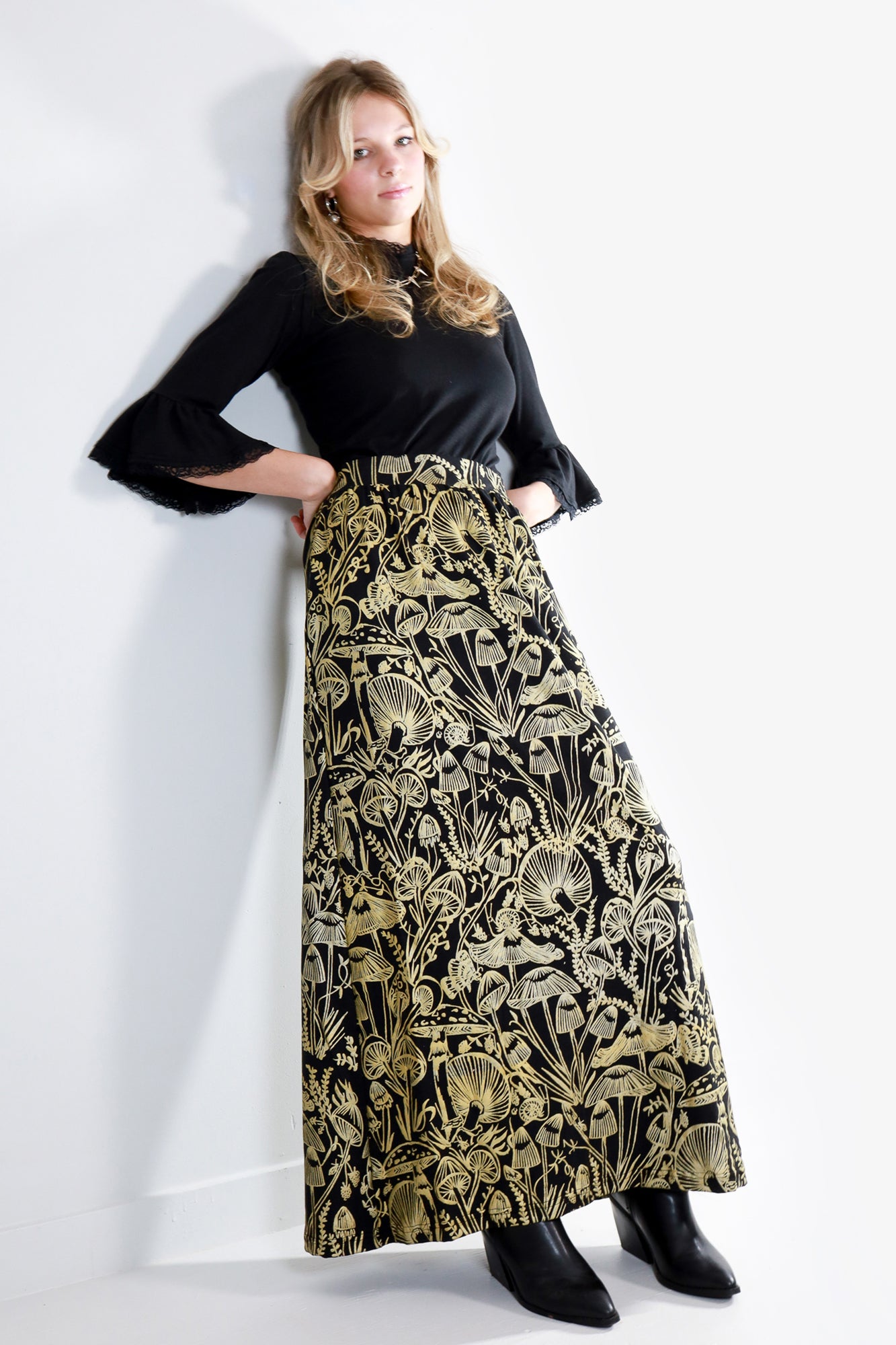 This maxi length, gathered skirt has roomy pockets and is accentuated with a comfortable 1.5” waistband. Try pairing it with one of our turtlenecks for the ultimate stylish look.