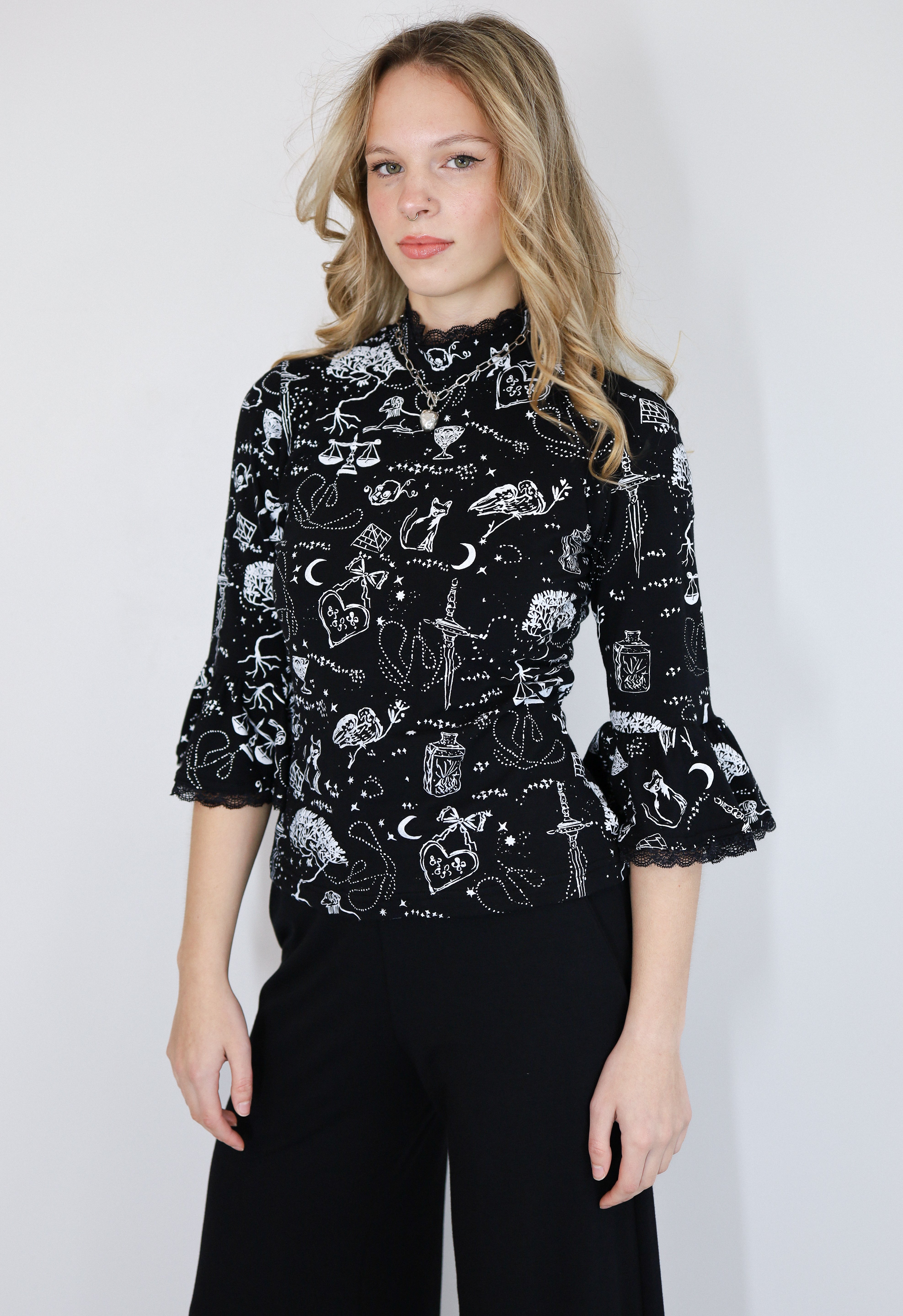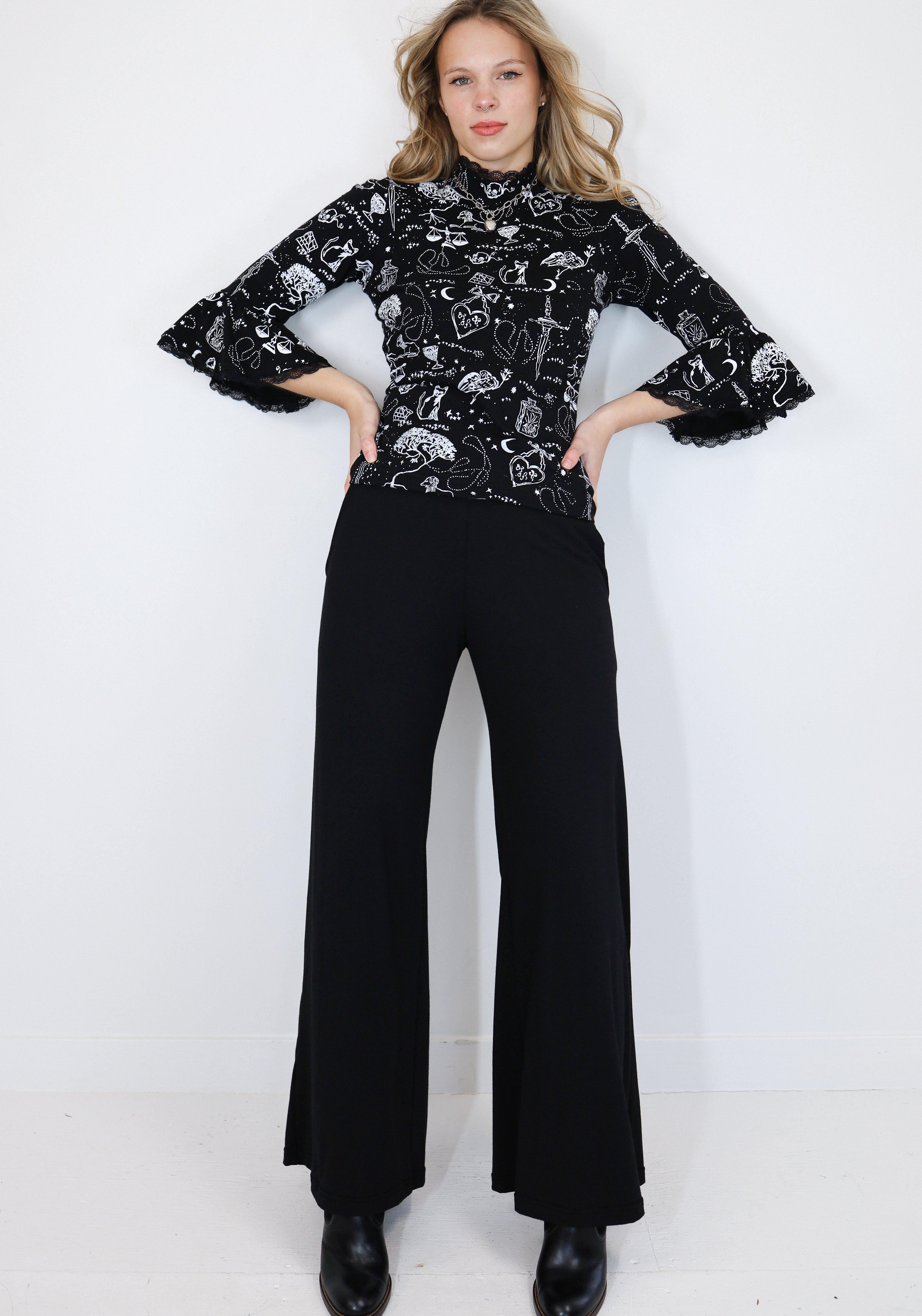 The Kiki Blouse is a stunner—graceful, dreamy, and surprisingly effortless. Made from our ultra-soft, breathable, organic cotton and bamboo stretch jersey, it offers the comfort of stretch with the elegance of a carefully tailored silhouette. A lace-trimmed mock neck and flowing bell sleeves drape beautifully over the forearm, adding a touch of vintage romance to this modern design.