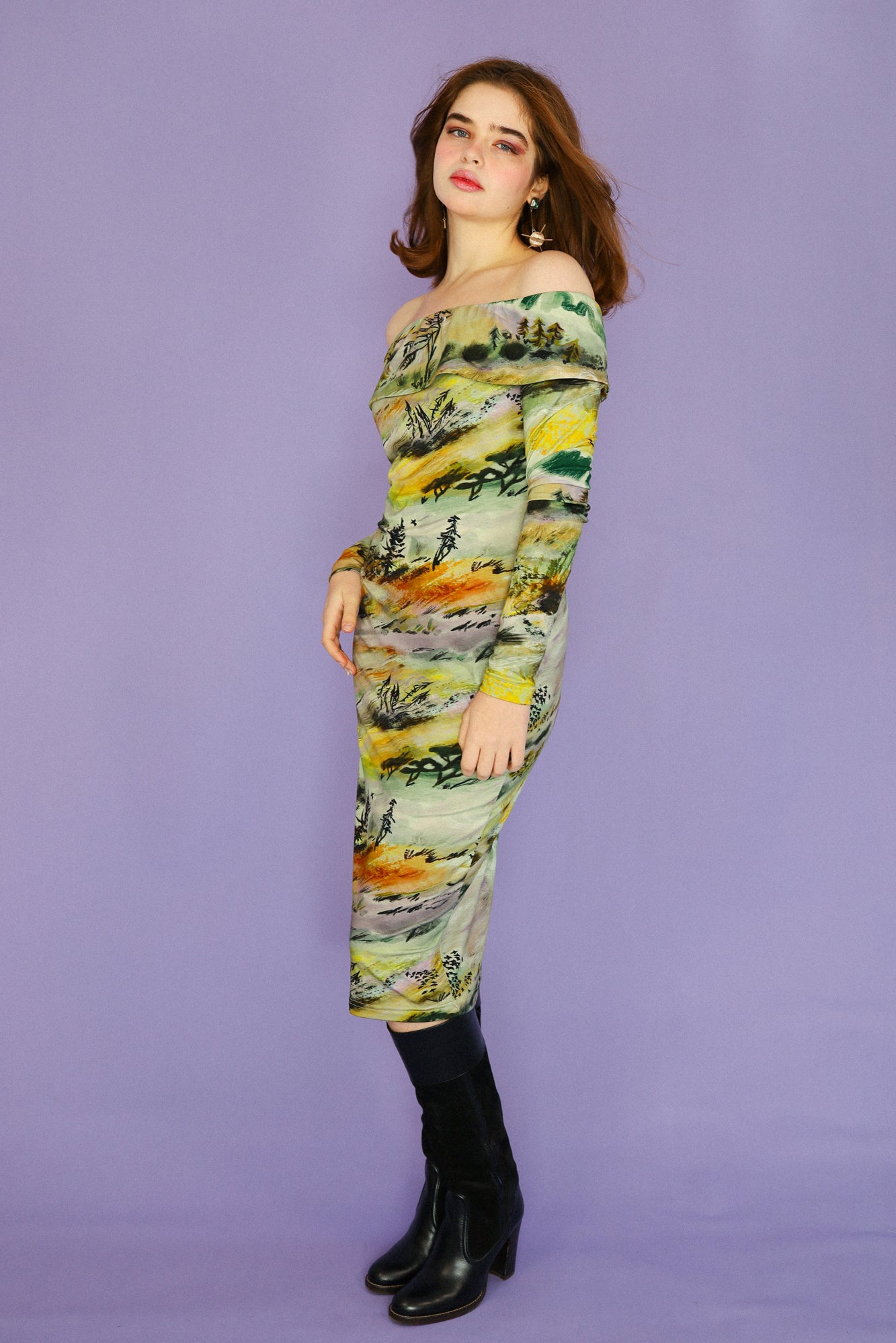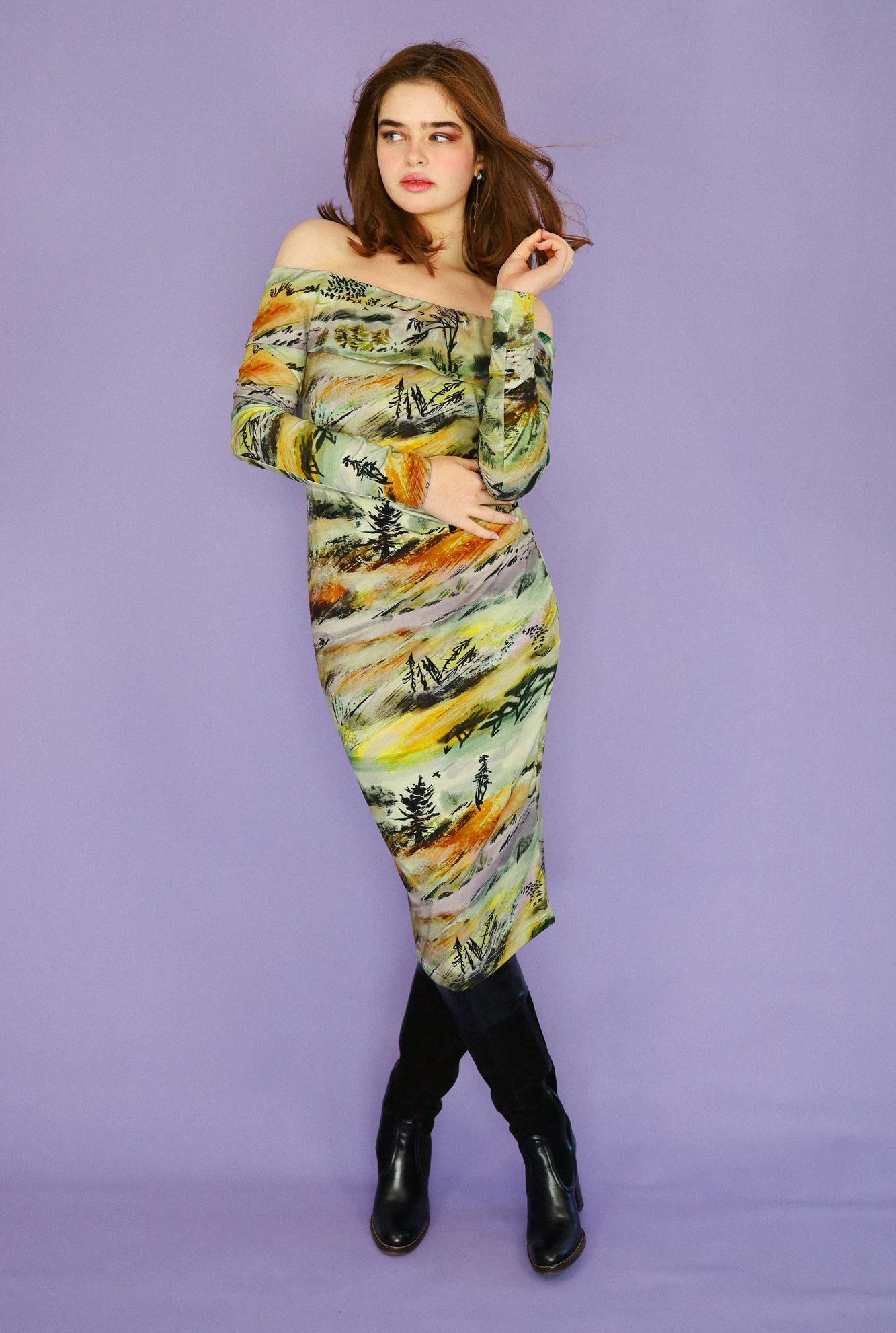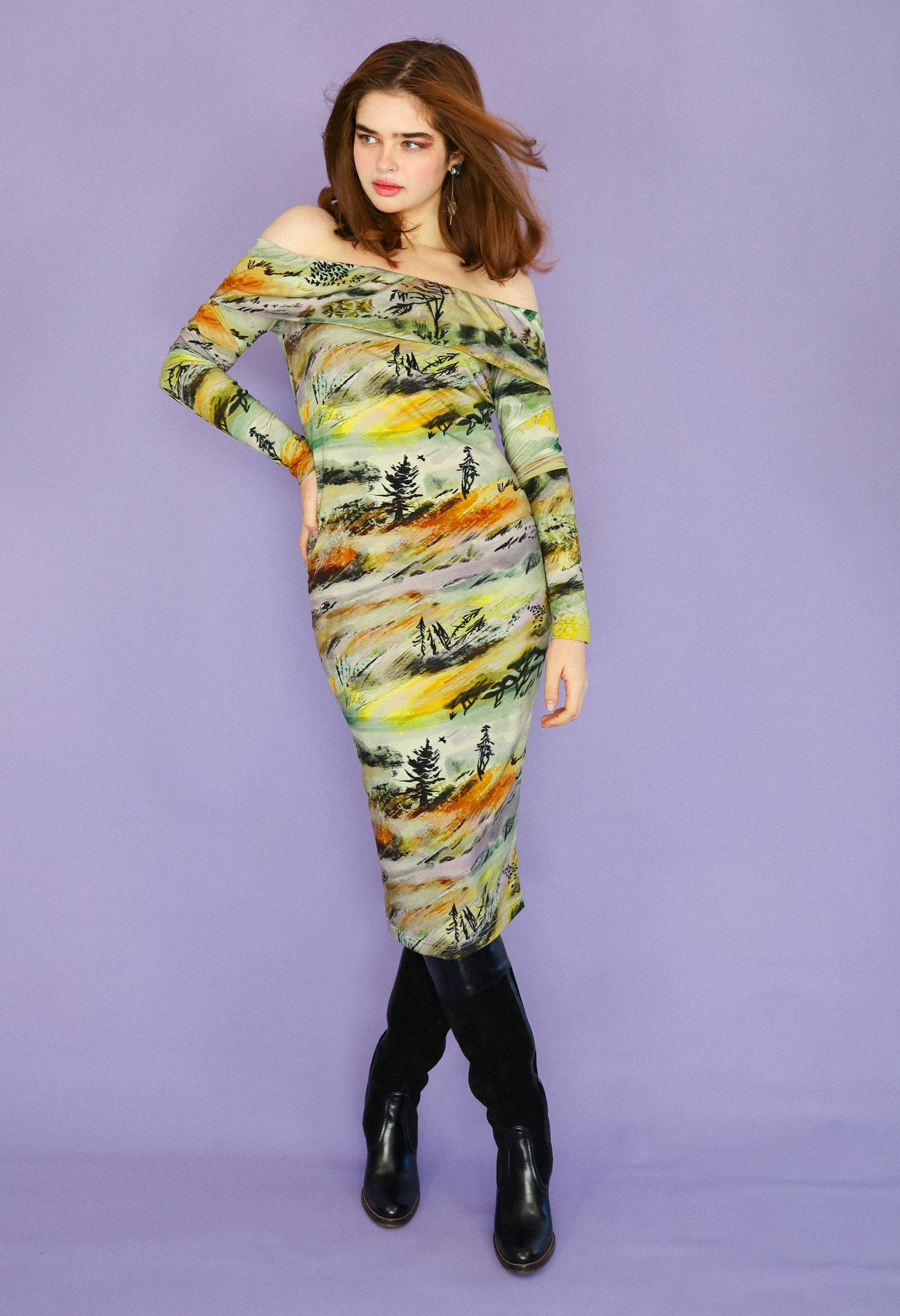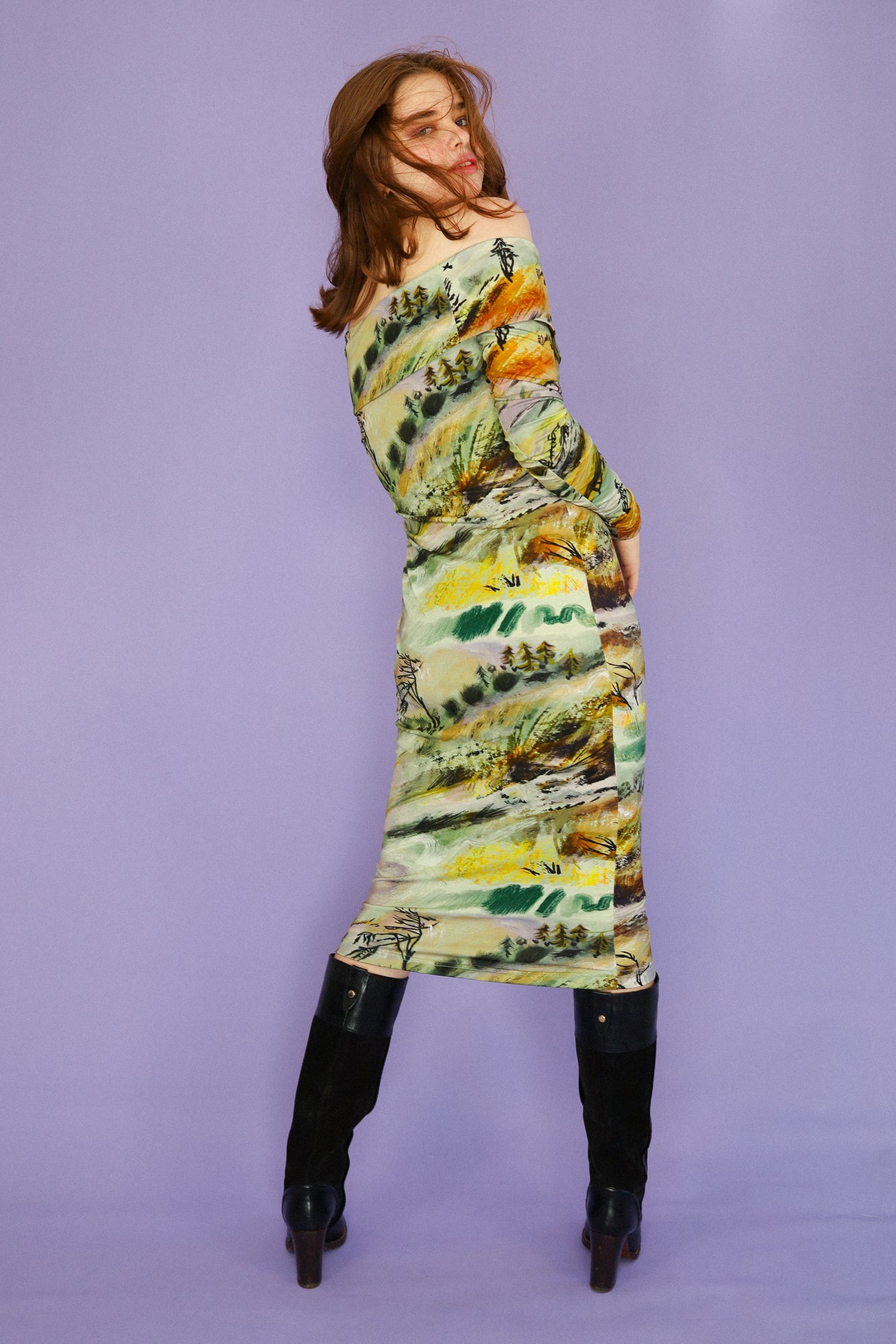 Rolling vibrant watercolour hills, a motif we can now achieve with our new digitally printed fabric. Made from a luxurious blend of bamboo, cotton and a little elastane for good measure. This fabric is breathable, moisture-wicking, and machine washable, with an incredible drape. Sewn in house into your perfect dress.