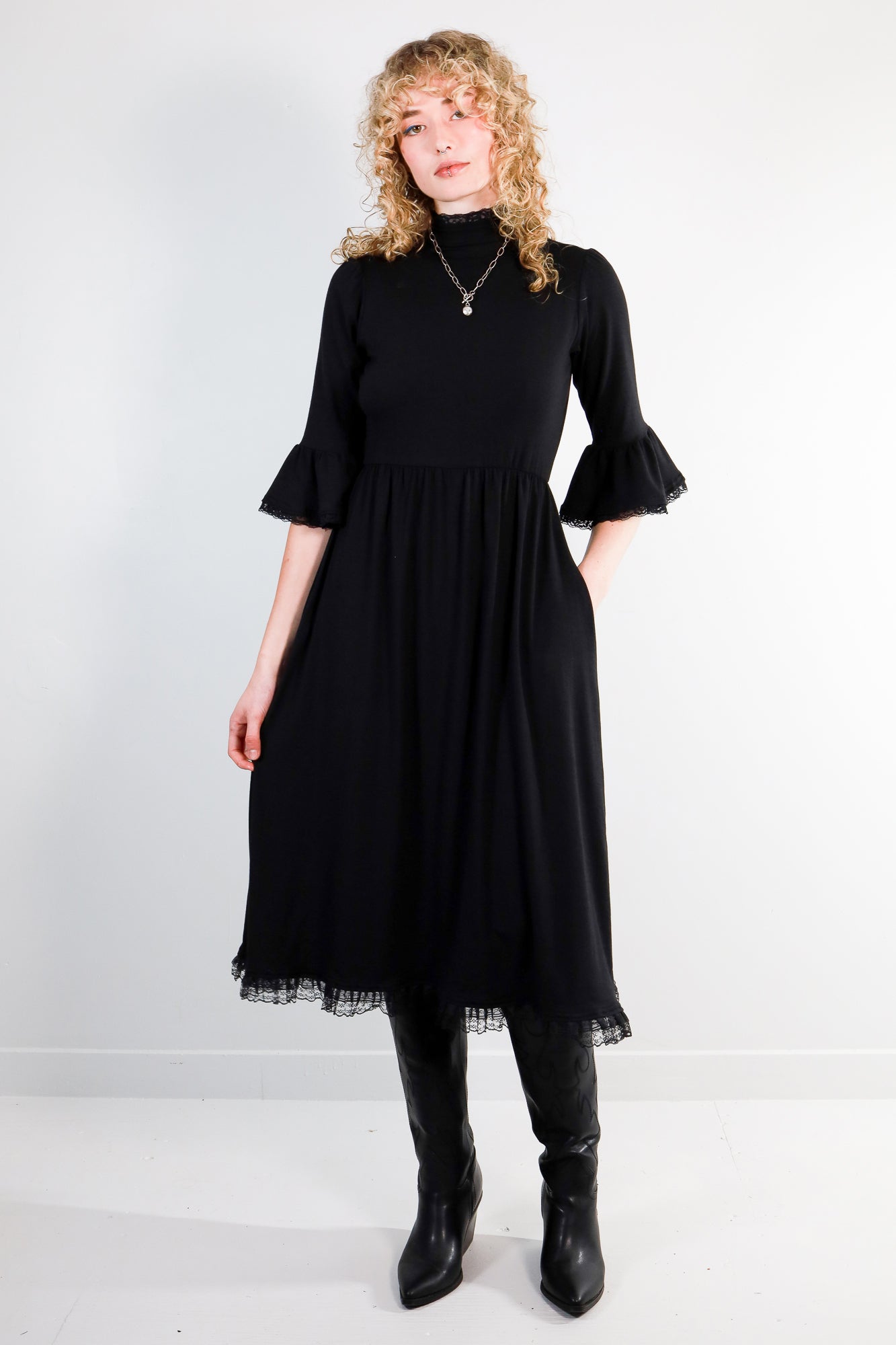 We don’t mind if you spill the tea in our new Kiki Dress (it’s machine washable). This tea length dress features a high lace mock-neck, and ¾ length lace-trimmed sleeves that flutter softly across the forearm. The full, gathered skirt panels are trimmed in our double-stacked lace for dramatic flare.