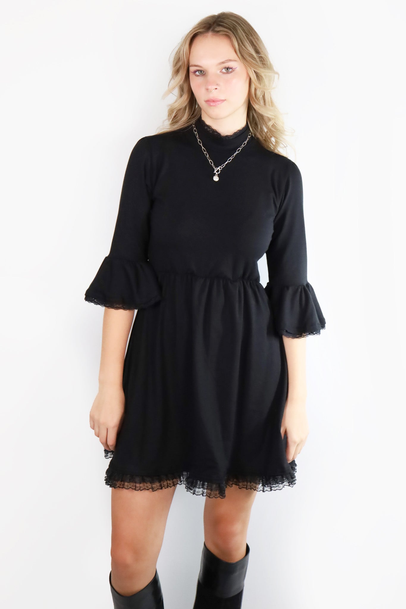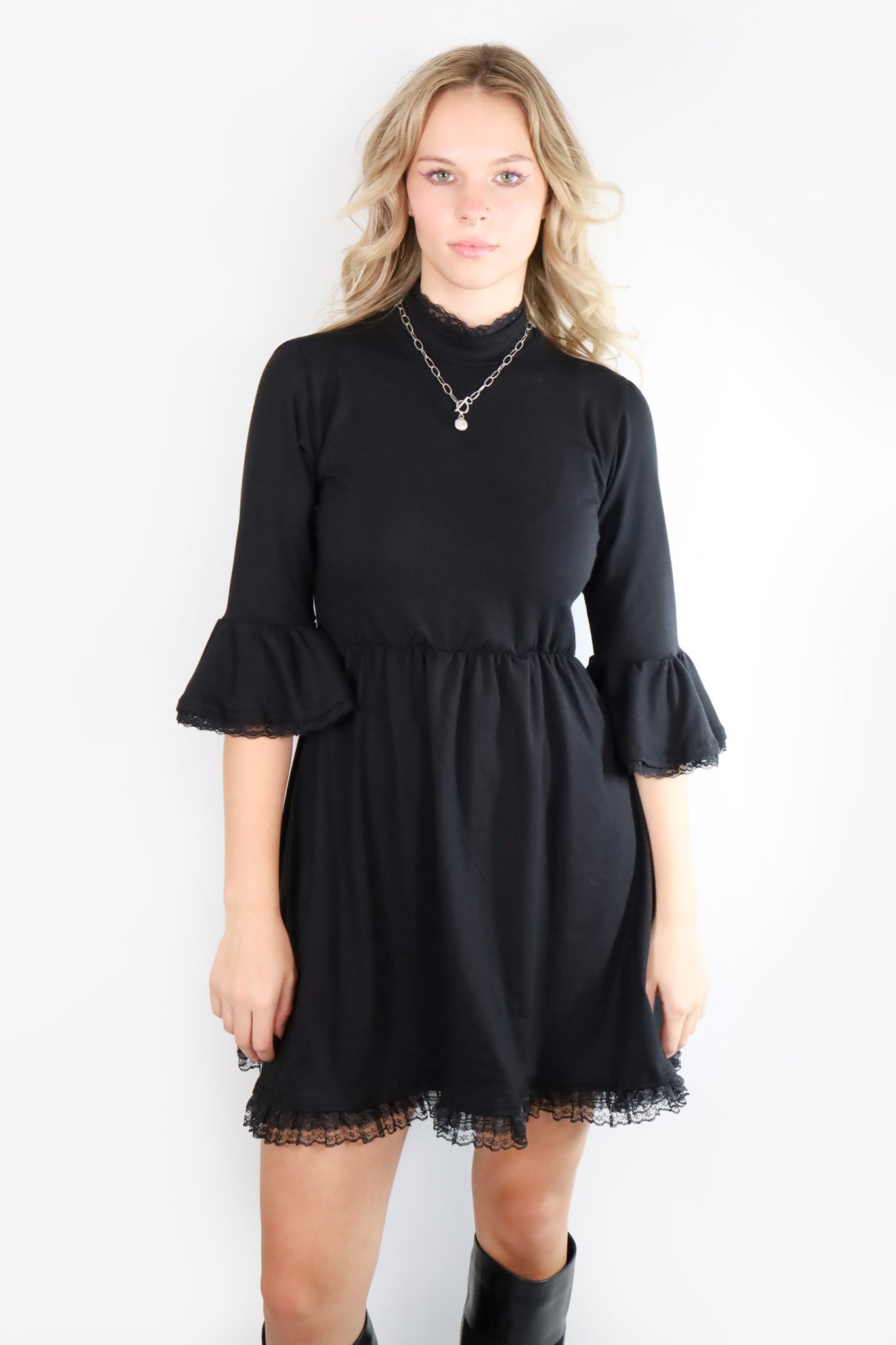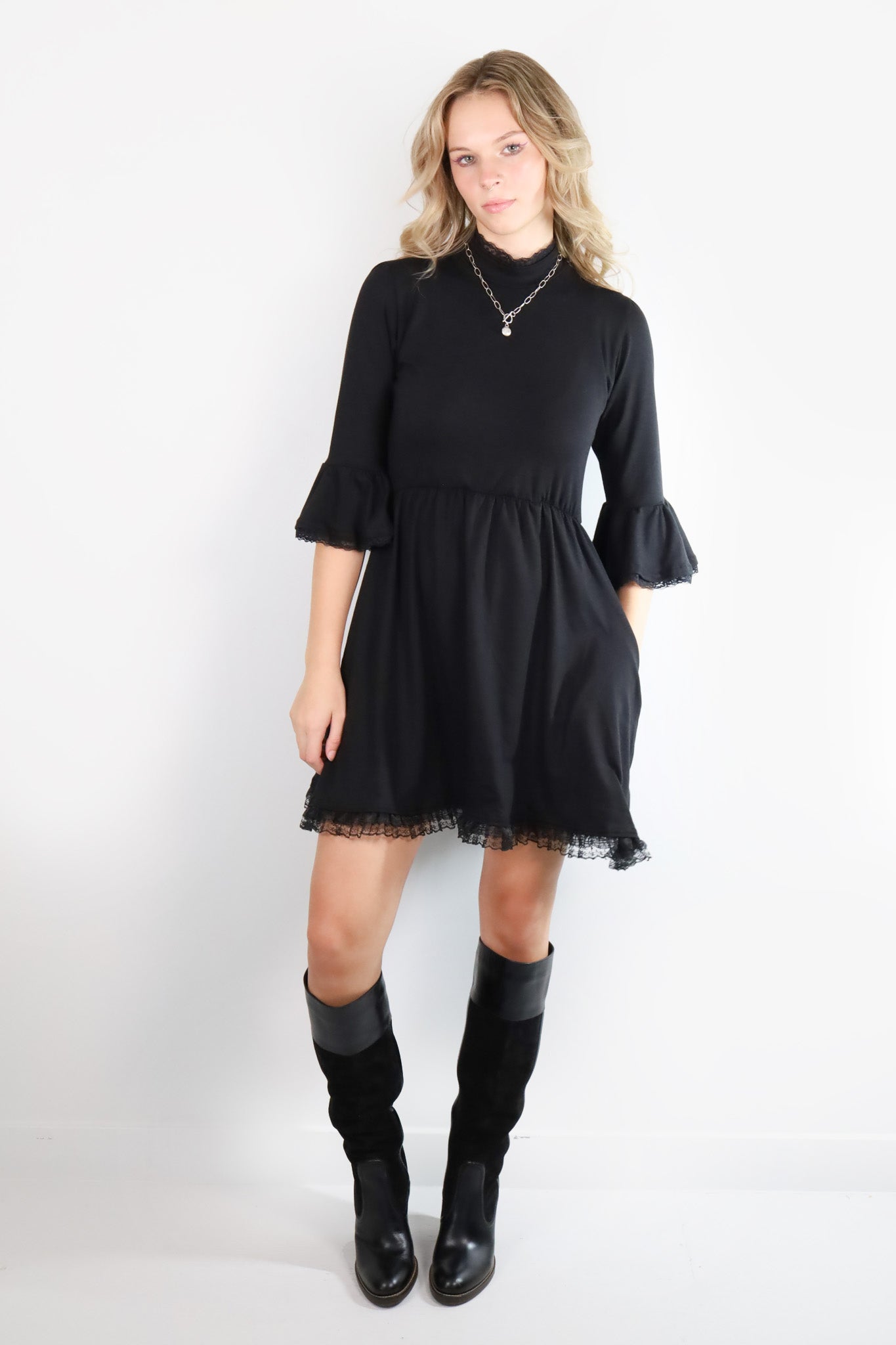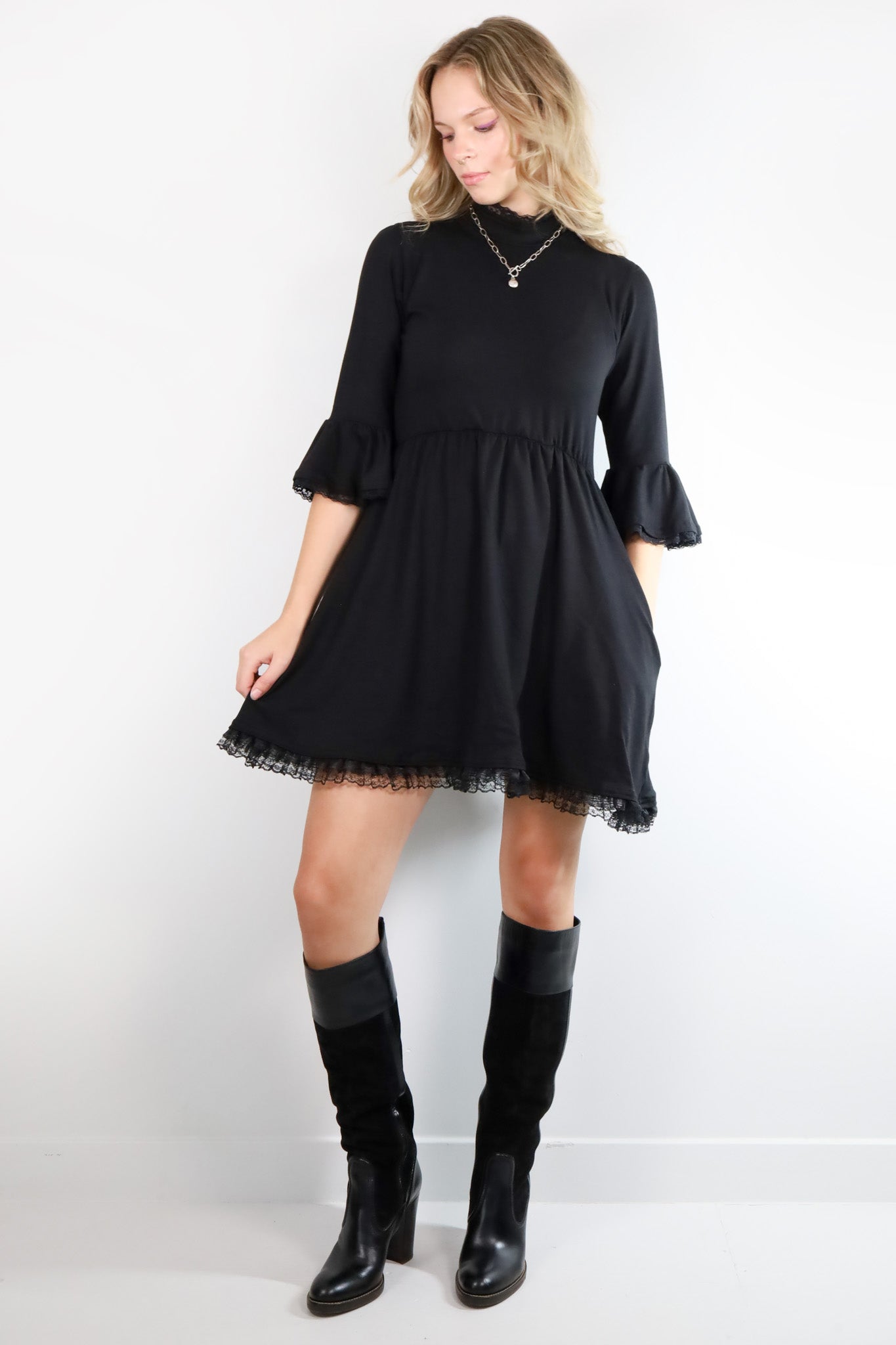 We don’t mind if you spill the tea in our new Kiki Dress (it’s machine washable). This tea length dress features a high lace mock-neck, and ¾ length lace-trimmed sleeves that flutter softly across the forearm. The full, gathered skirt panels are trimmed in our double-stacked lace for dramatic flare. Made from our signature bamboo/organic jersey.