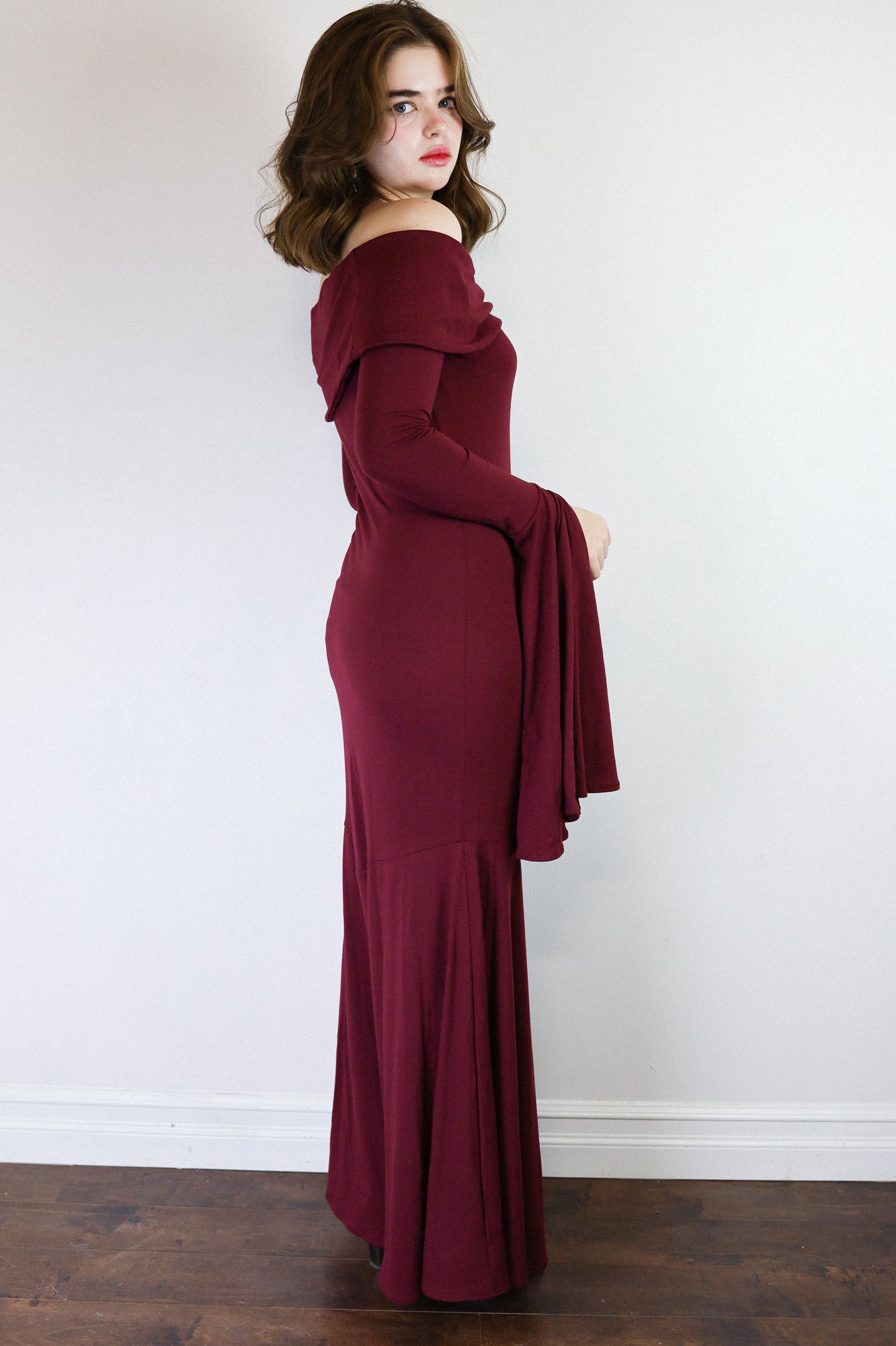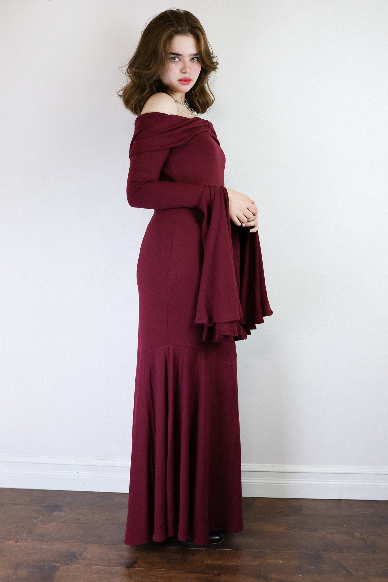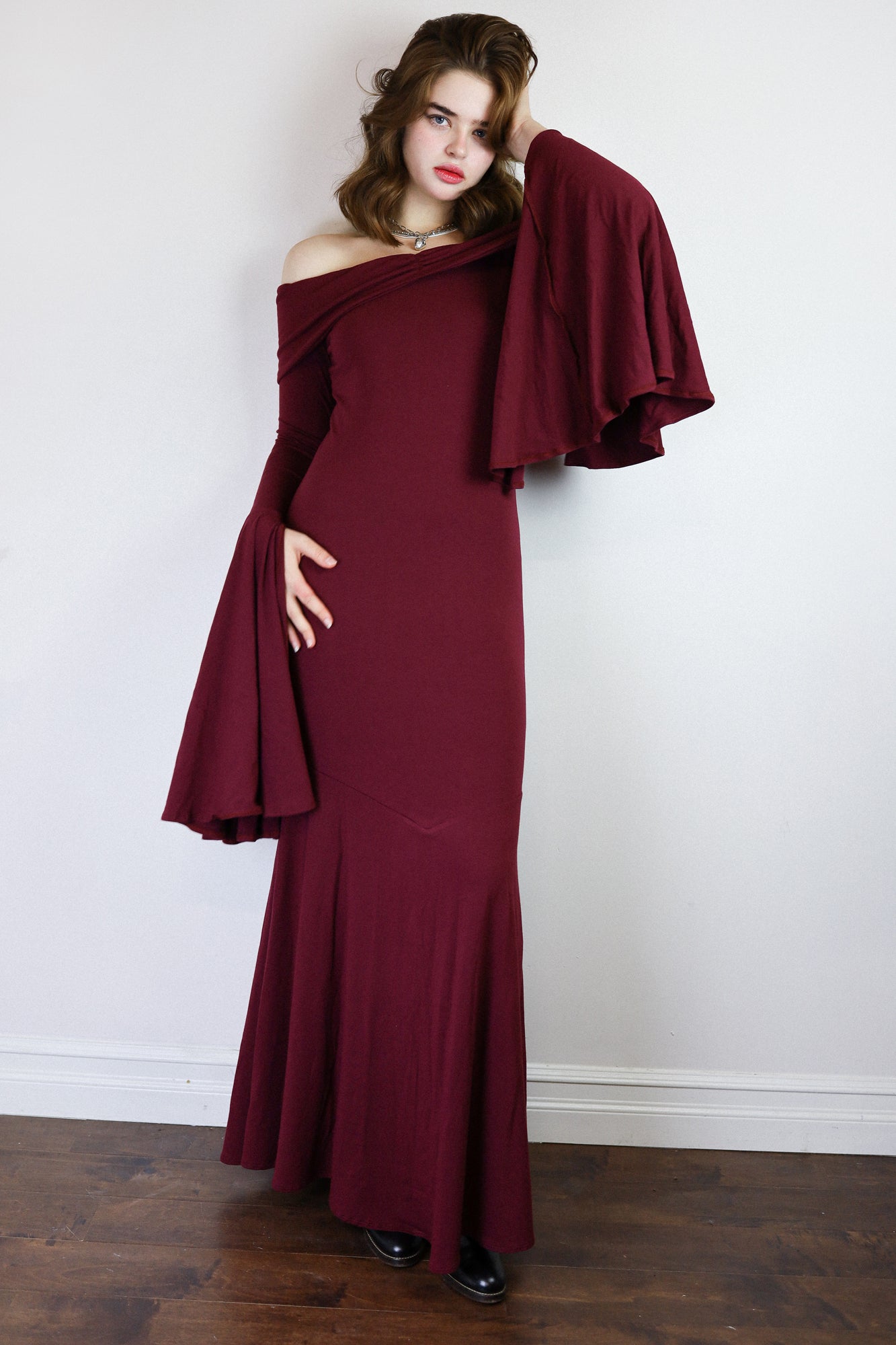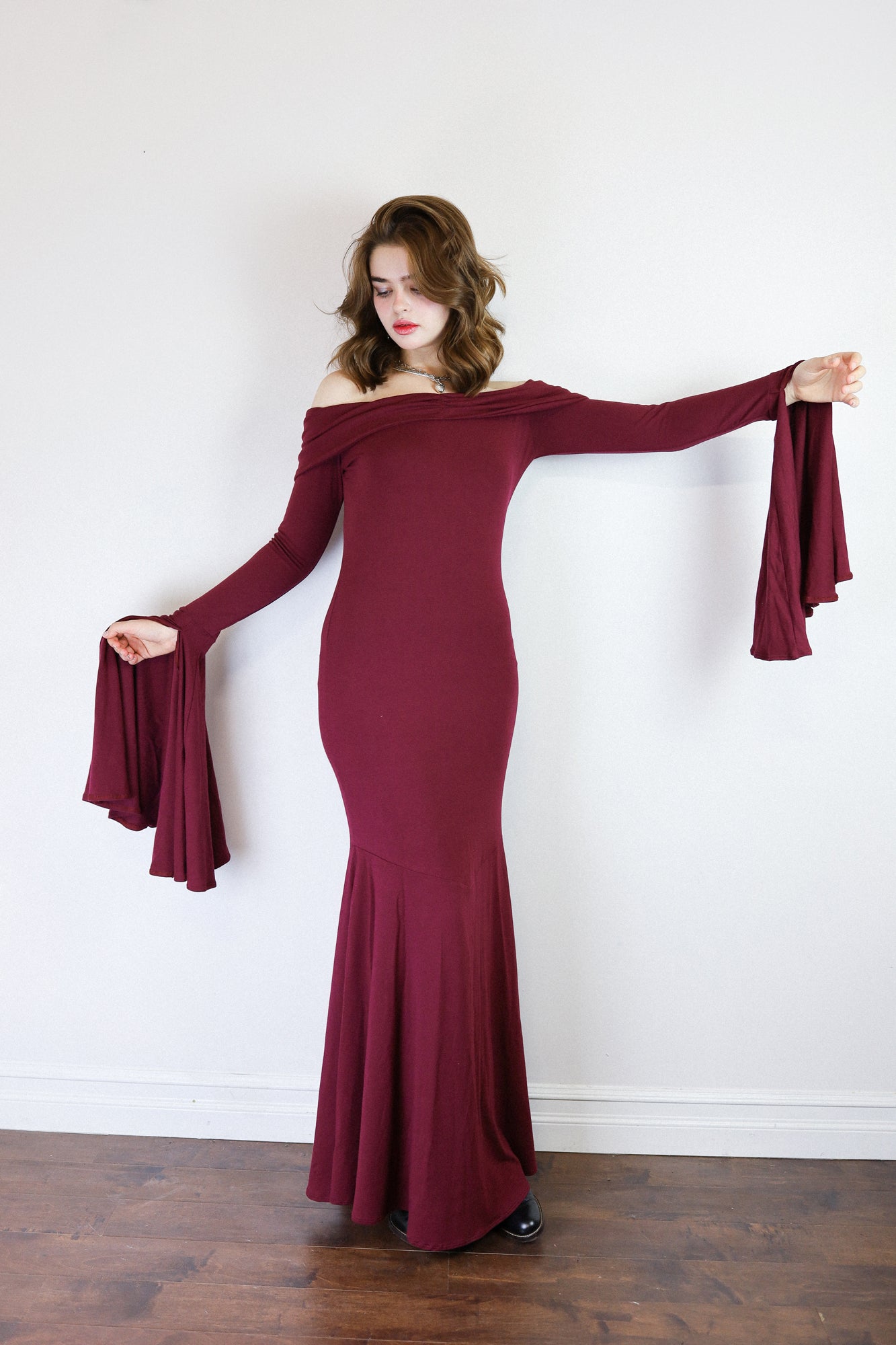 The Angelica Dress is a dramatic vision in our cotton-bamboo stretch jersey, sculpting the body with a sleek, elongated fit that cascades into a striking, floor-skimming flare. Its smooth, fluid drape creates effortless movement with each step, captivating as you glide across the floor. Soft, breathable stretch keeps it comfortable while maintaining its undeniably sultry shape.