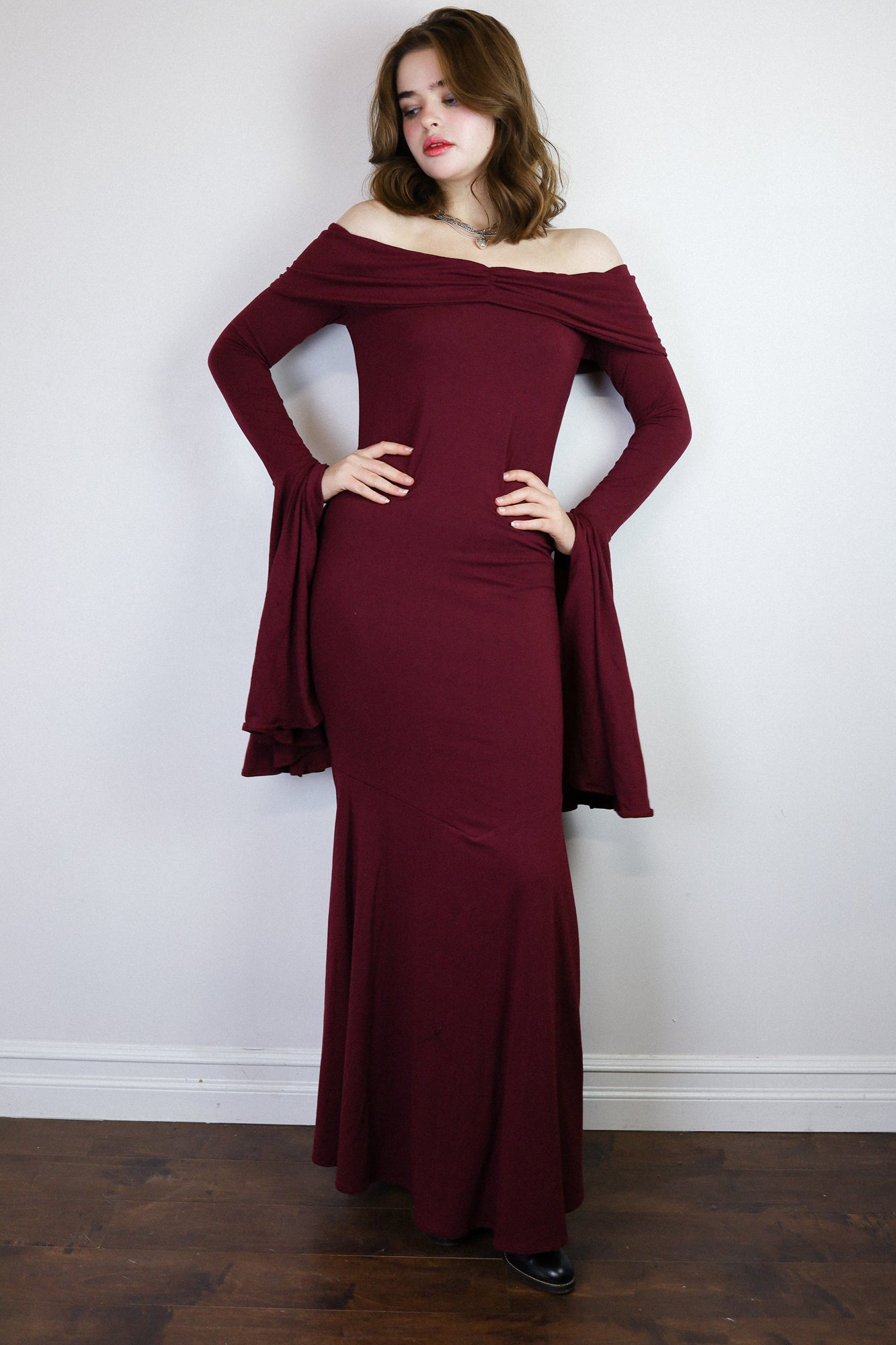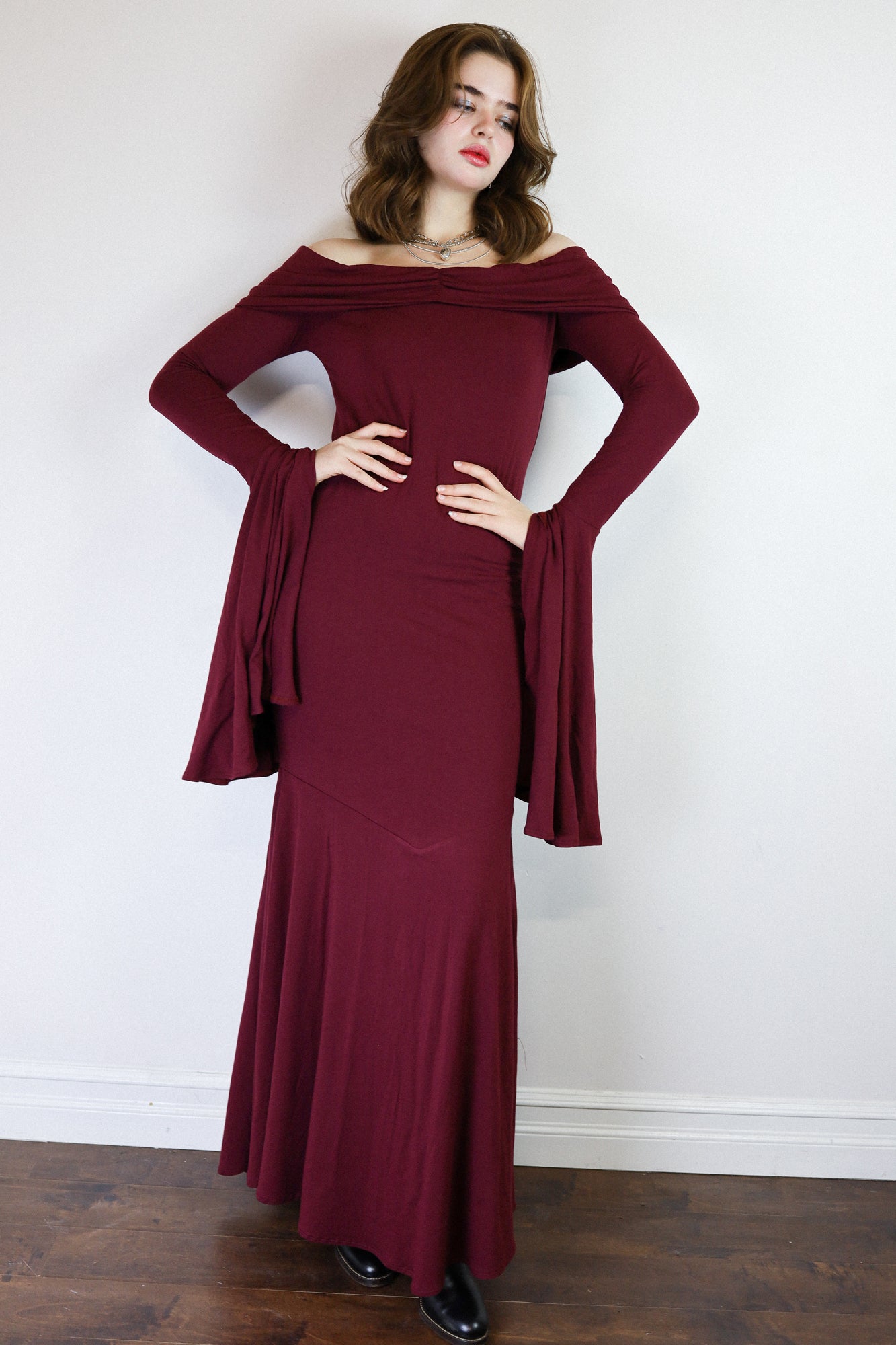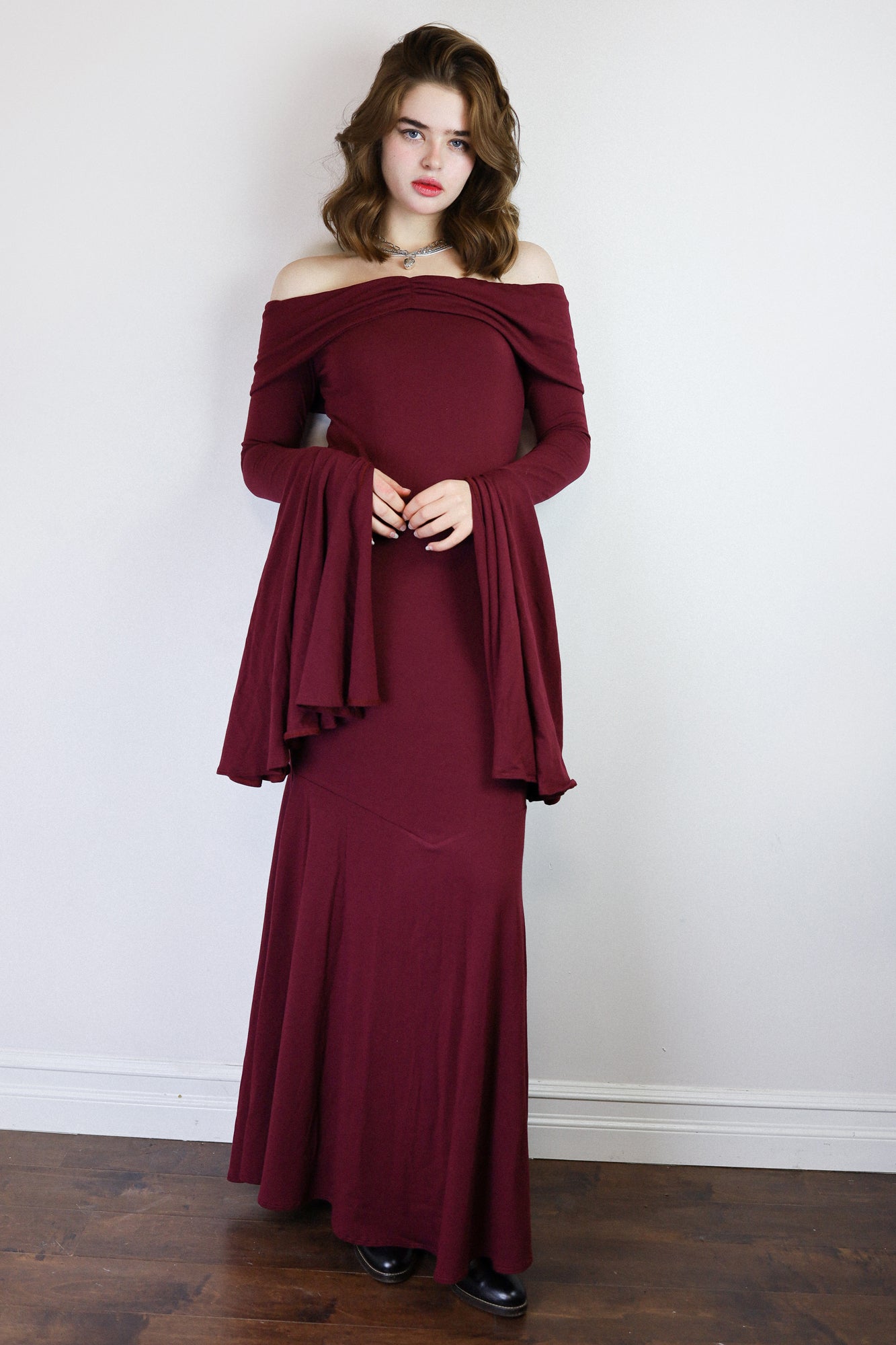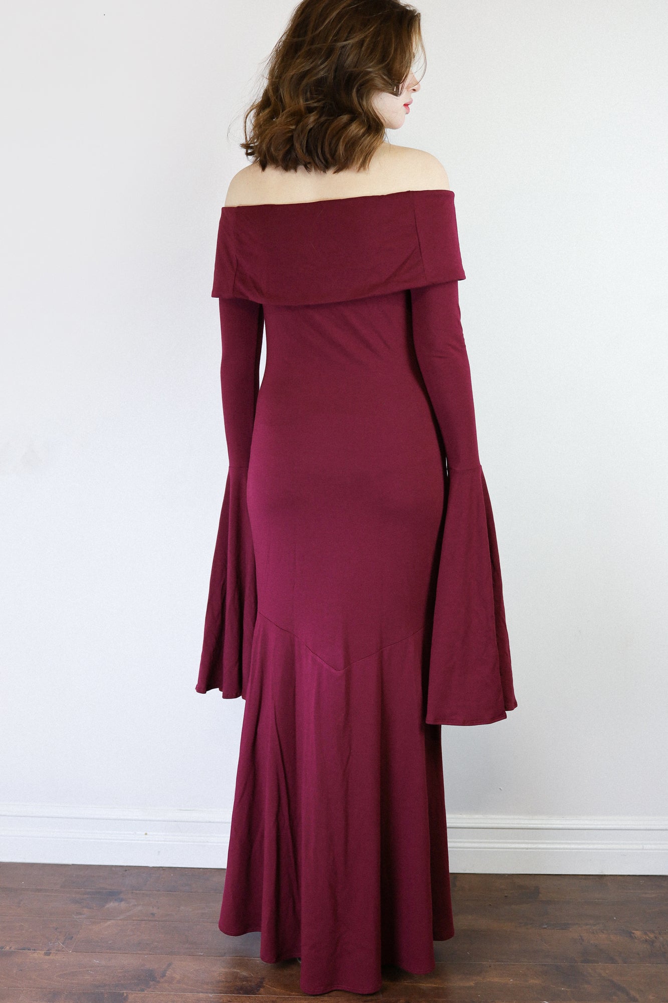The Angelica Dress is a dramatic vision in our cotton-bamboo stretch jersey, sculpting the body with a sleek, elongated fit that cascades into a striking, floor-skimming flare. Its smooth, fluid drape creates effortless movement with each step, captivating as you glide across the floor. Soft, breathable stretch keeps it comfortable while maintaining its undeniably sultry shape.