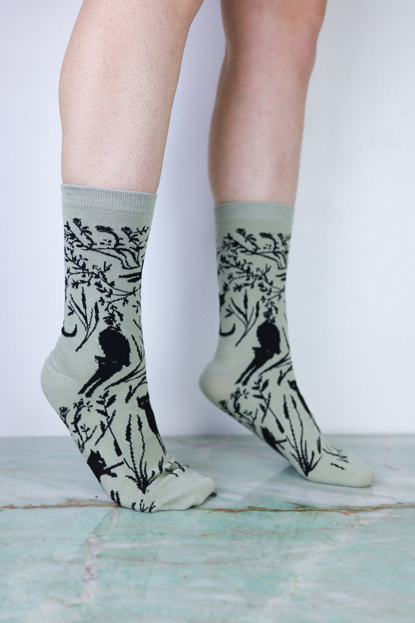 Pair of socks with black animal and plant pattern on a light gray background