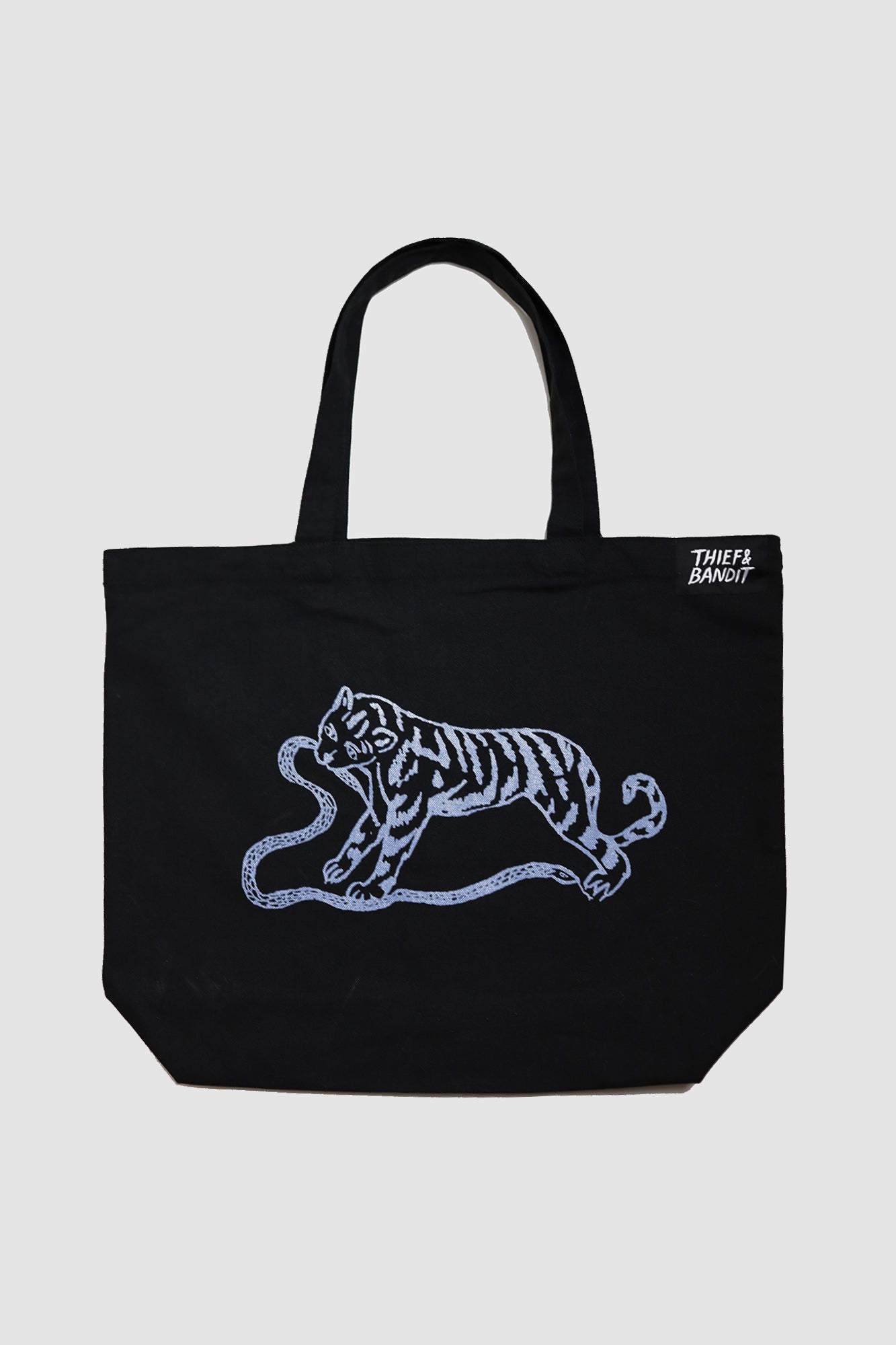 100% recycled cotton printed Tiger Snake tote, sewn from a durable cotton and finished with an outer facing Thief&Bandit label. Measures roughly 19" x 16" with a 10" shoulder strap.
