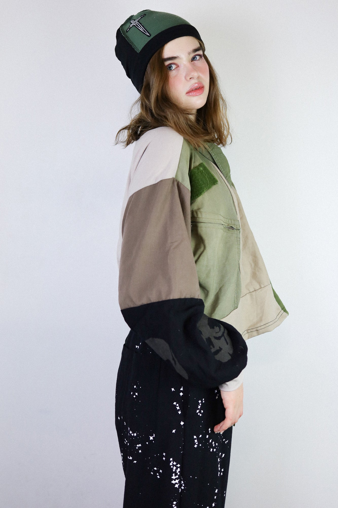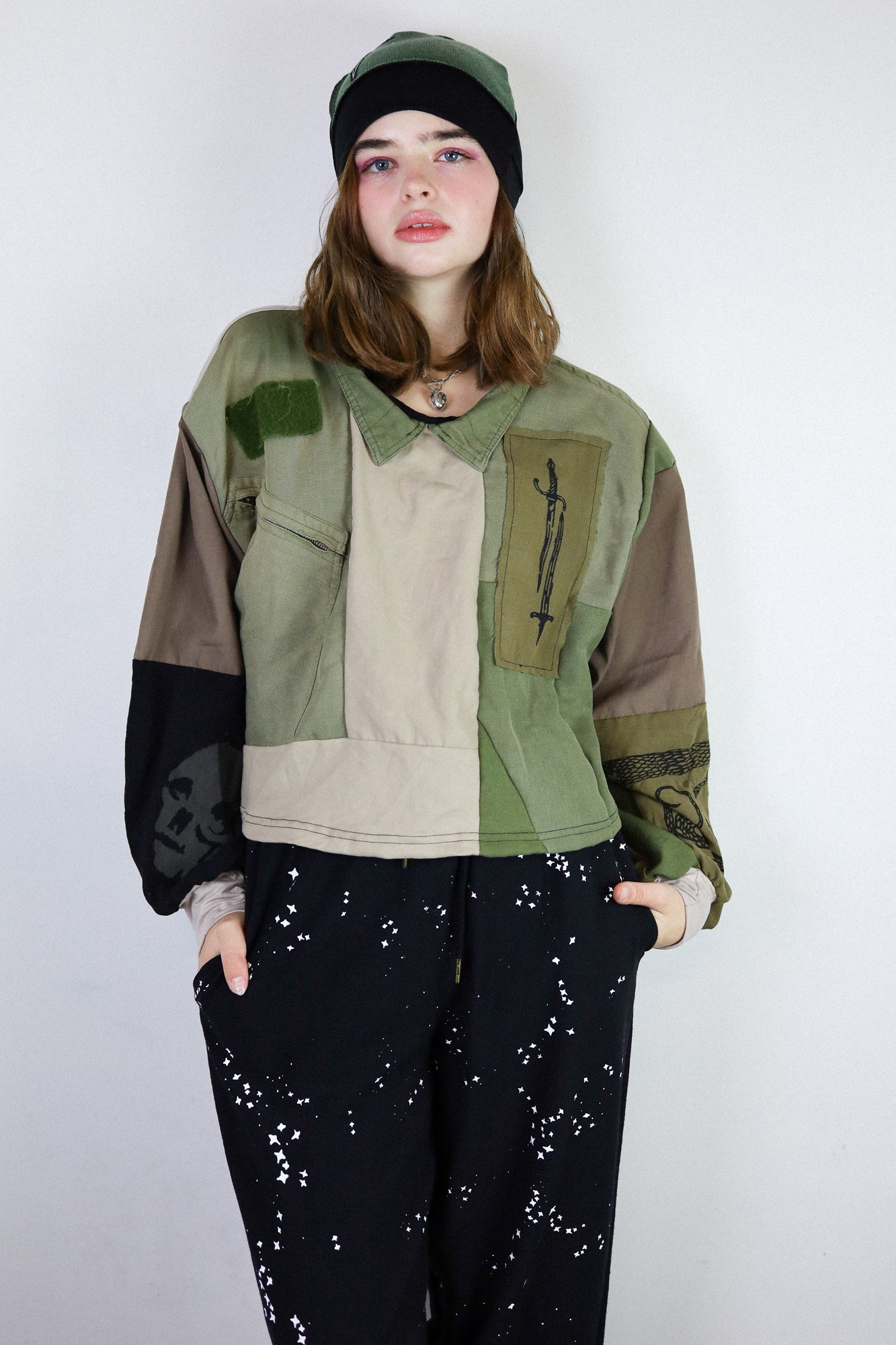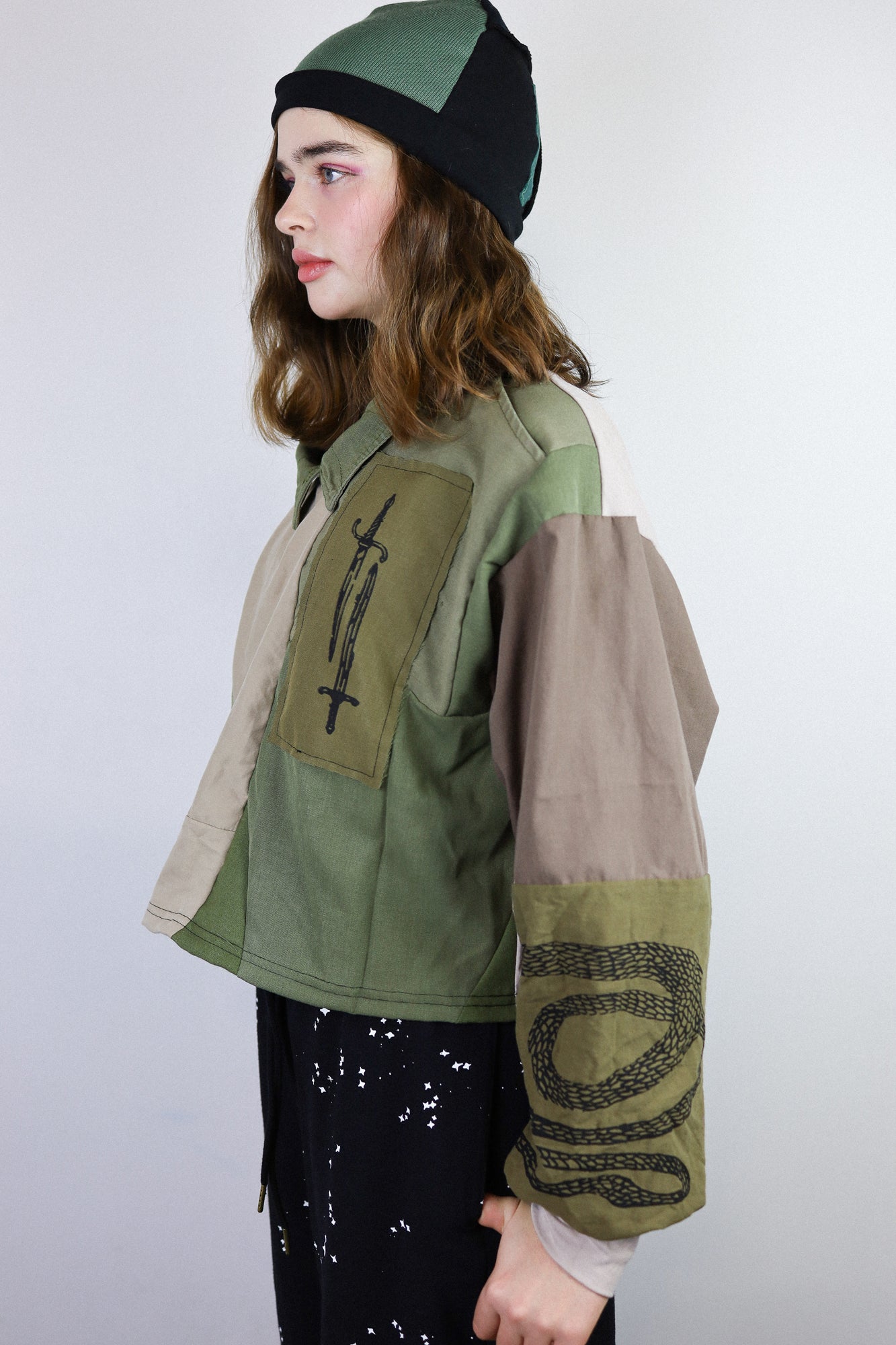 Each garment featured in our Reworked drops is one-of-a-kind. As all of our pieces are made to order in house, we've been stashing our off cuts for moments like this, creating one of a kind garments that are both wearable and unique. Please reach out for any sizing questions. Due to the intricate nature of the reworked process, items can be exchanged for store credit. If you're interested in a piece, but don't see your size available, or the piece has sold out, please feel free to contact us and express your interest. Although we cannot guarantee an identical remake, we can usually achieve something with a similar aesthetic.