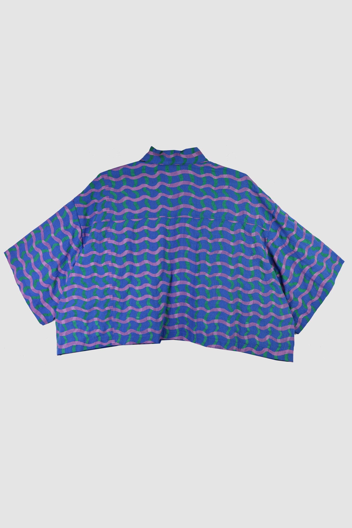 Printed in-house in our Wavy Plaid print—A reimagining of a classic with a playful twist. Two squiggly lines of overlapping color create a loose, hand-drawn grid that feels both structured and spontaneous. The result? A vibrant, artsy pop of color that brings movement and joy to any look.