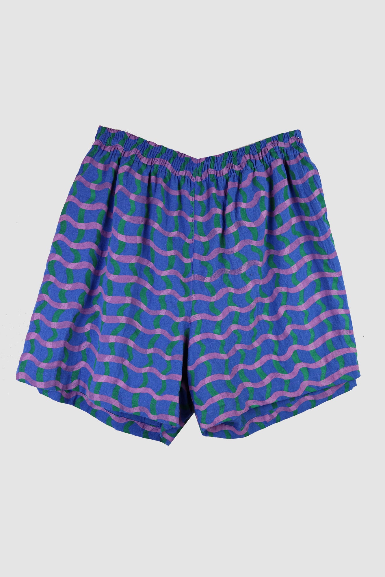 Printed in-house in our Wavy Plaid print—A reimagining of a classic with a playful twist. Two squiggly lines of overlapping color create a loose, hand-drawn grid that feels both structured and spontaneous. The result? A vibrant, artsy pop of color that brings movement and joy to any look.