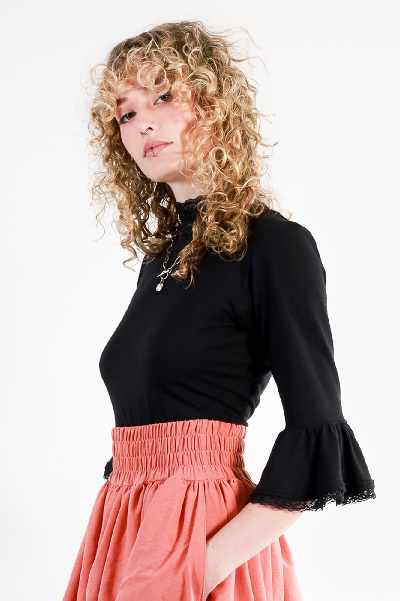 This elegant blouse features a high lace mock-neck, and ¾ length lace-trimmed sleeves that flutter softly across the forearm. Each sleeve also has a small amount of gathering at the shoulder for an added feminine touch. Made from our signature bamboo/organic cotton spandex blend jersey.
