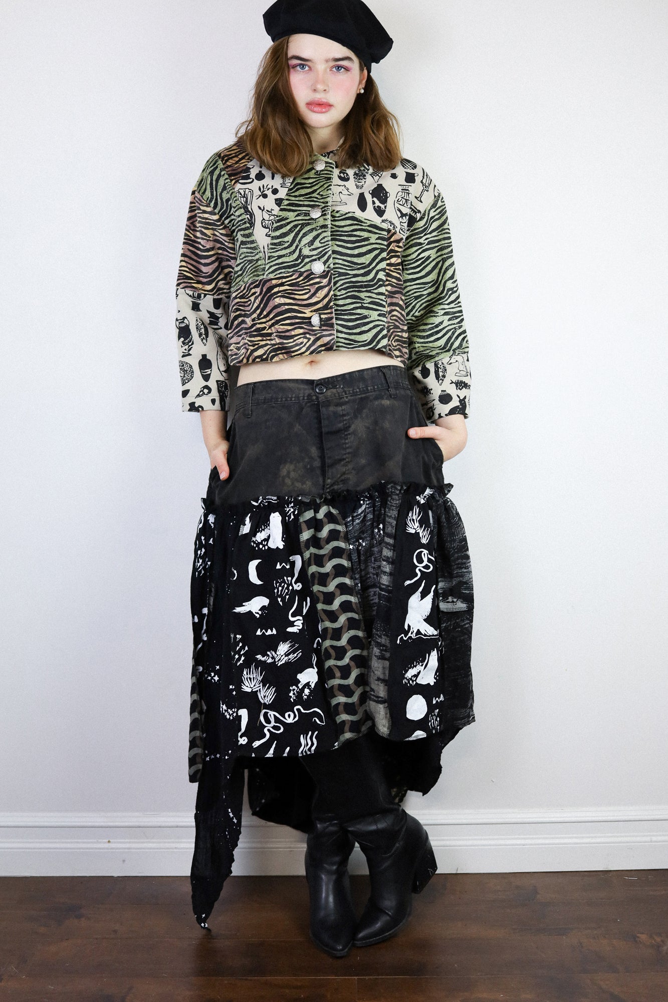 A scrappy lil' number that'll turn heads. One of a kind and made with Thief&Bandit remnants. It has an adjustable waistband that'll extend from a 31.5" - 37" waist.