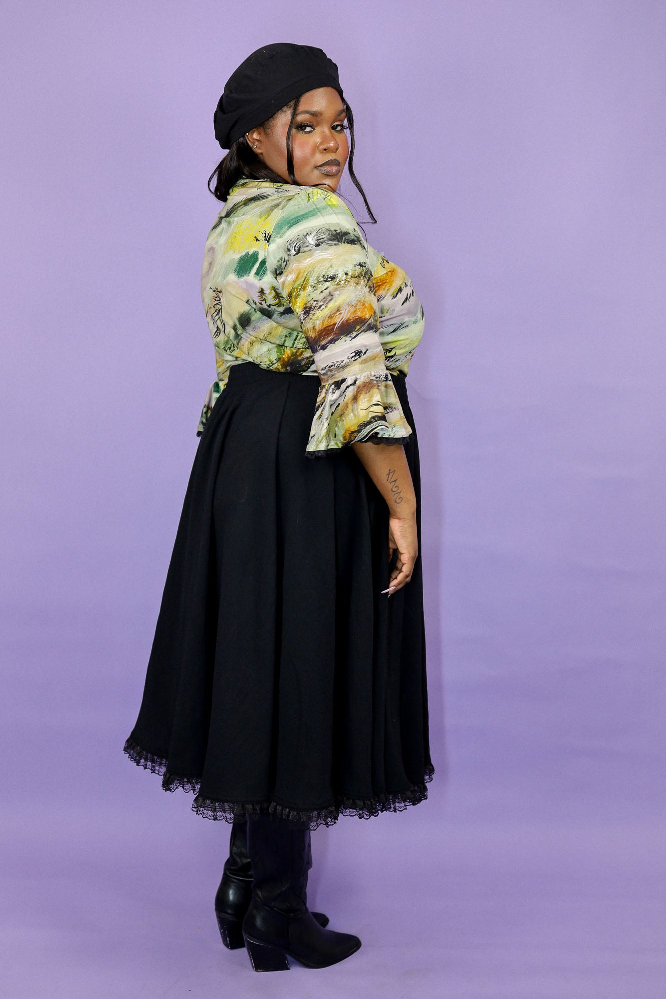 The Margot Skirt (now with lace!) is a midi-length circle skirt cut in six panels for the perfect balance of structure and flow. It drapes with grace, twirls with ease, and feels just as good as it looks. The wide, elasticized 2" waistband offers a comfortable fit with a clean finish, while the large side pockets bring function to its refined silhouette. Whether you're dressing it up with the Kiki Blouse or keeping it casual with a tee, Margot always adds a touch of grace.