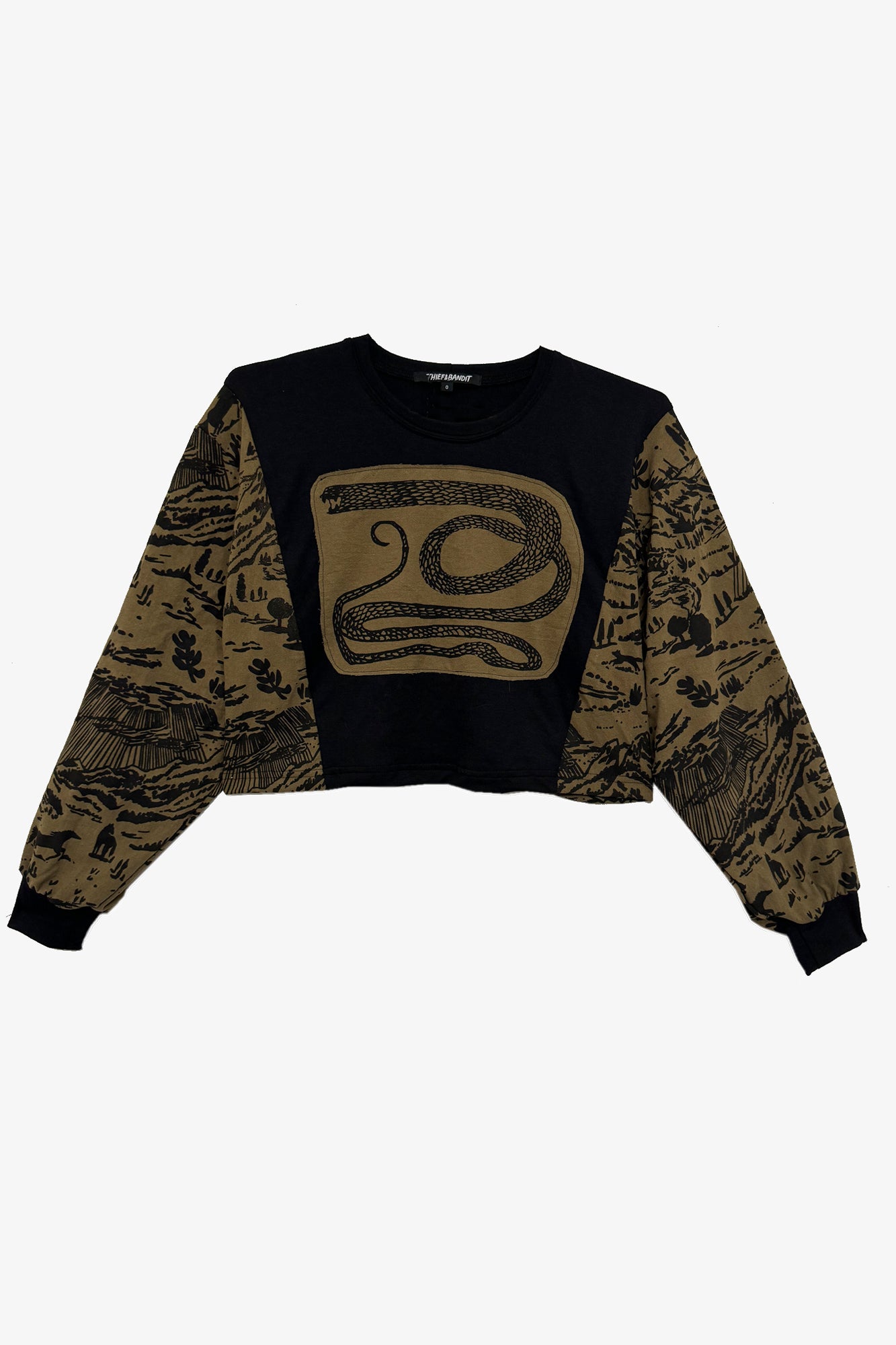 Travel the dusty trails, meandering rivers and towering peaks of Shadow Canyon. This landscape was designed with the west in mind. Unleash your inner adventurer and join us in the canyon. Paired with our appliquéd Serpent print this top is one of a kind.