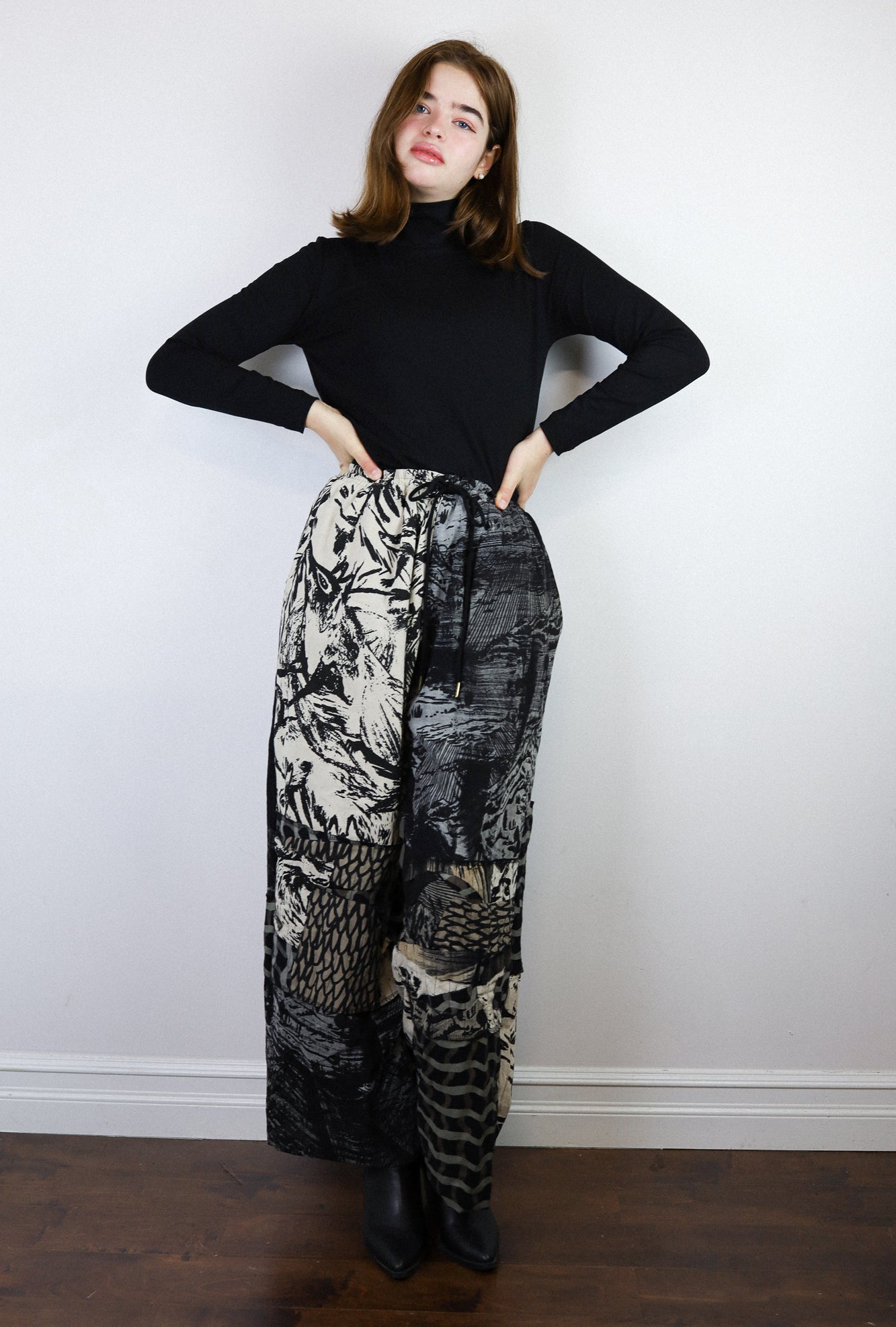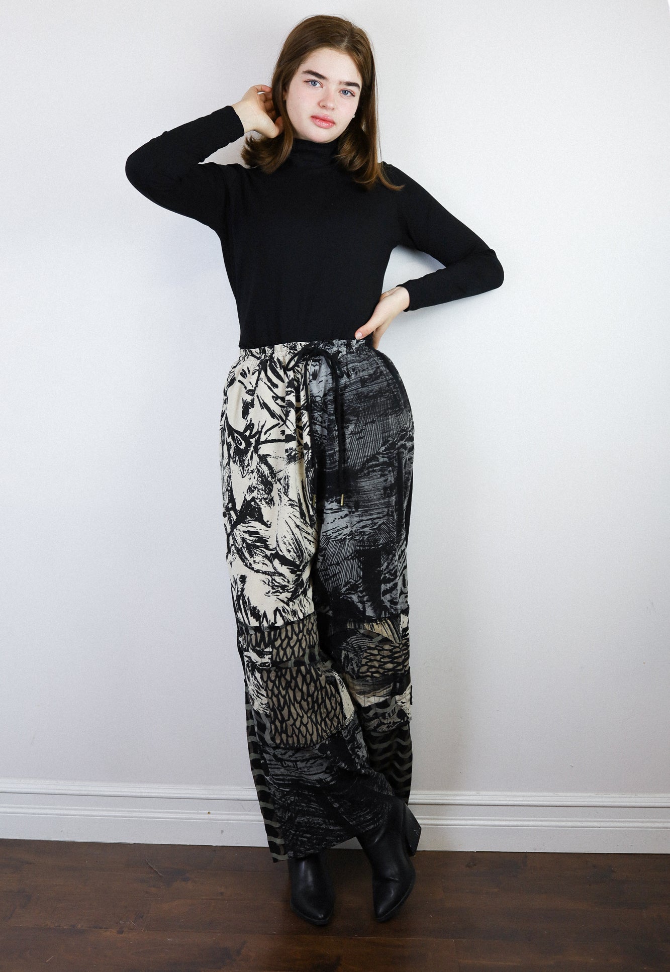 Genderless pants, made from cotton crepe and vintage/scrap fabrics in a loose straight leg style. They feature side and back pockets and a relaxed fit, with an elasticized waist and drawstring, making them super comfy.