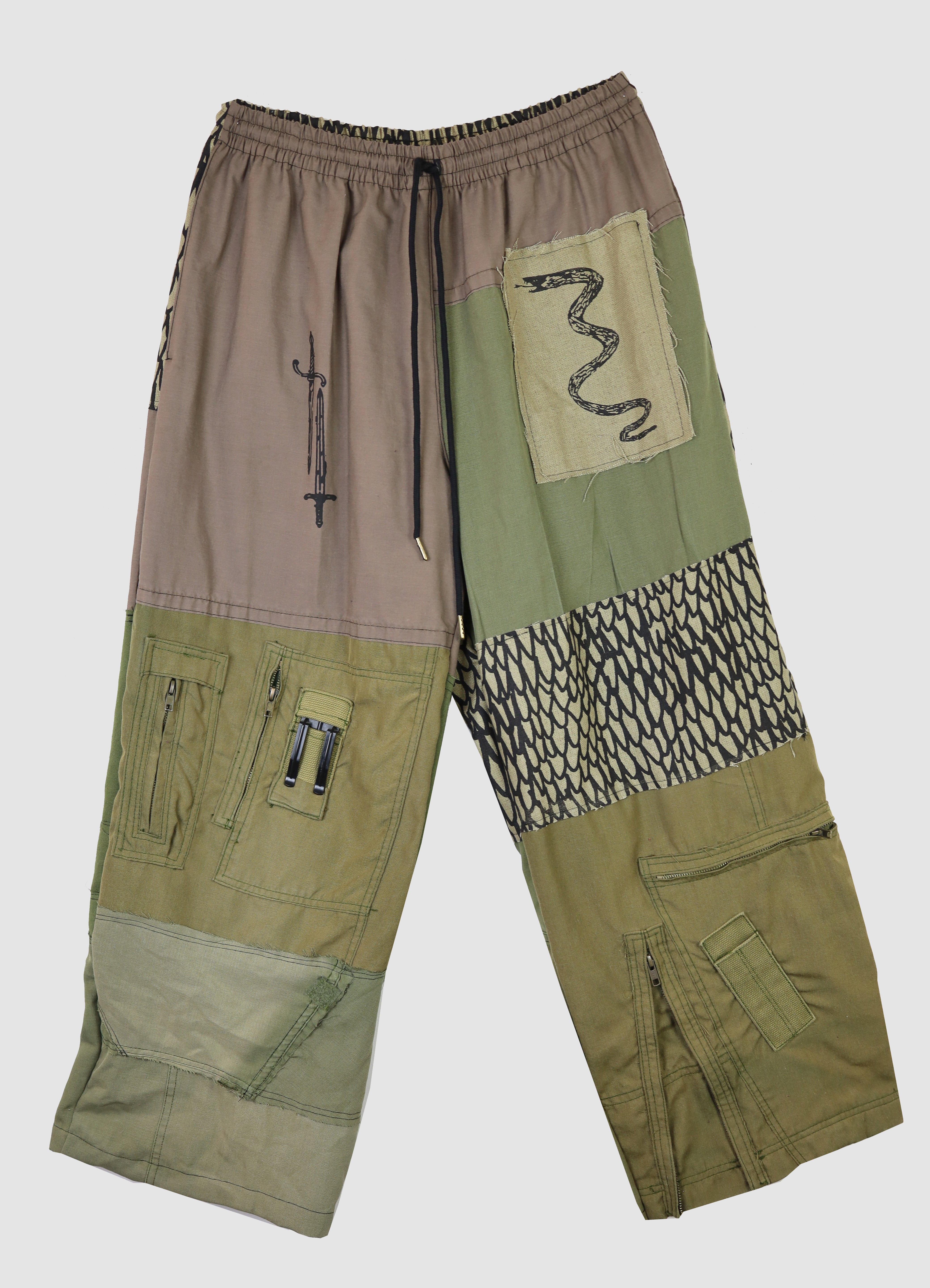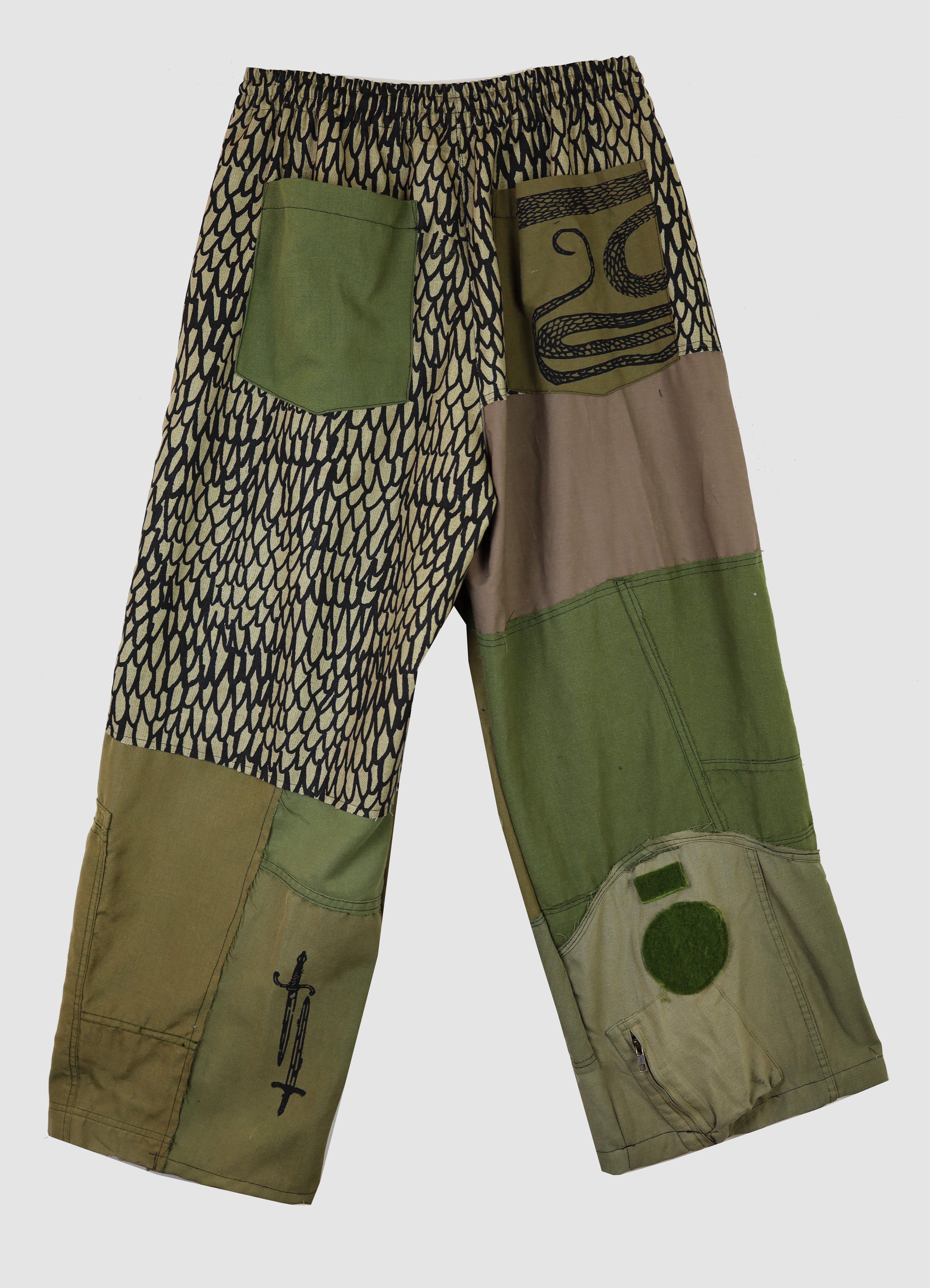 Genderless pants, made from cotton crepe and vintage/scrap fabrics in a loose straight leg style. They feature side and back pockets and a relaxed fit, with an elasticized waist and drawstring, making them super comfy.
